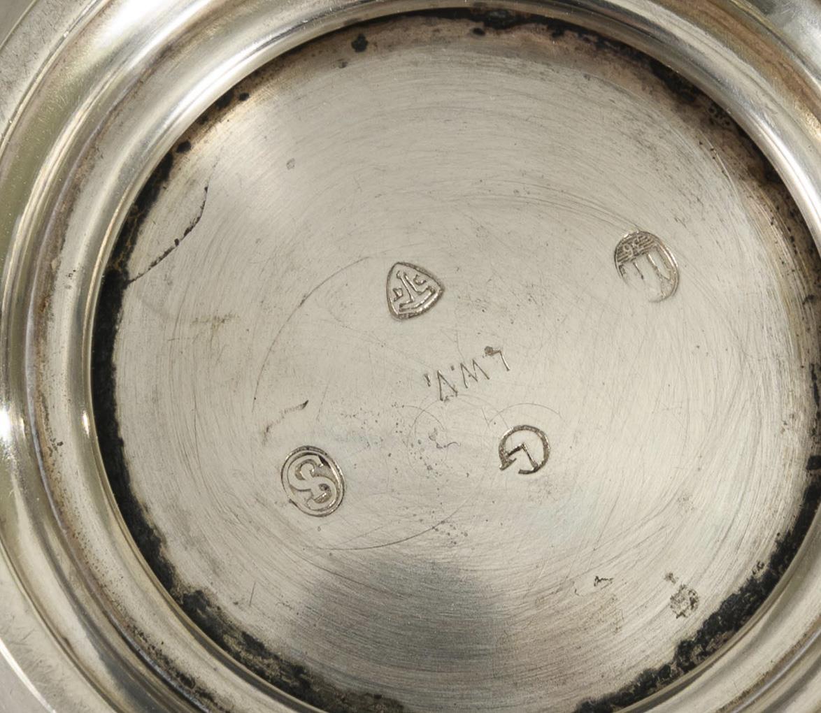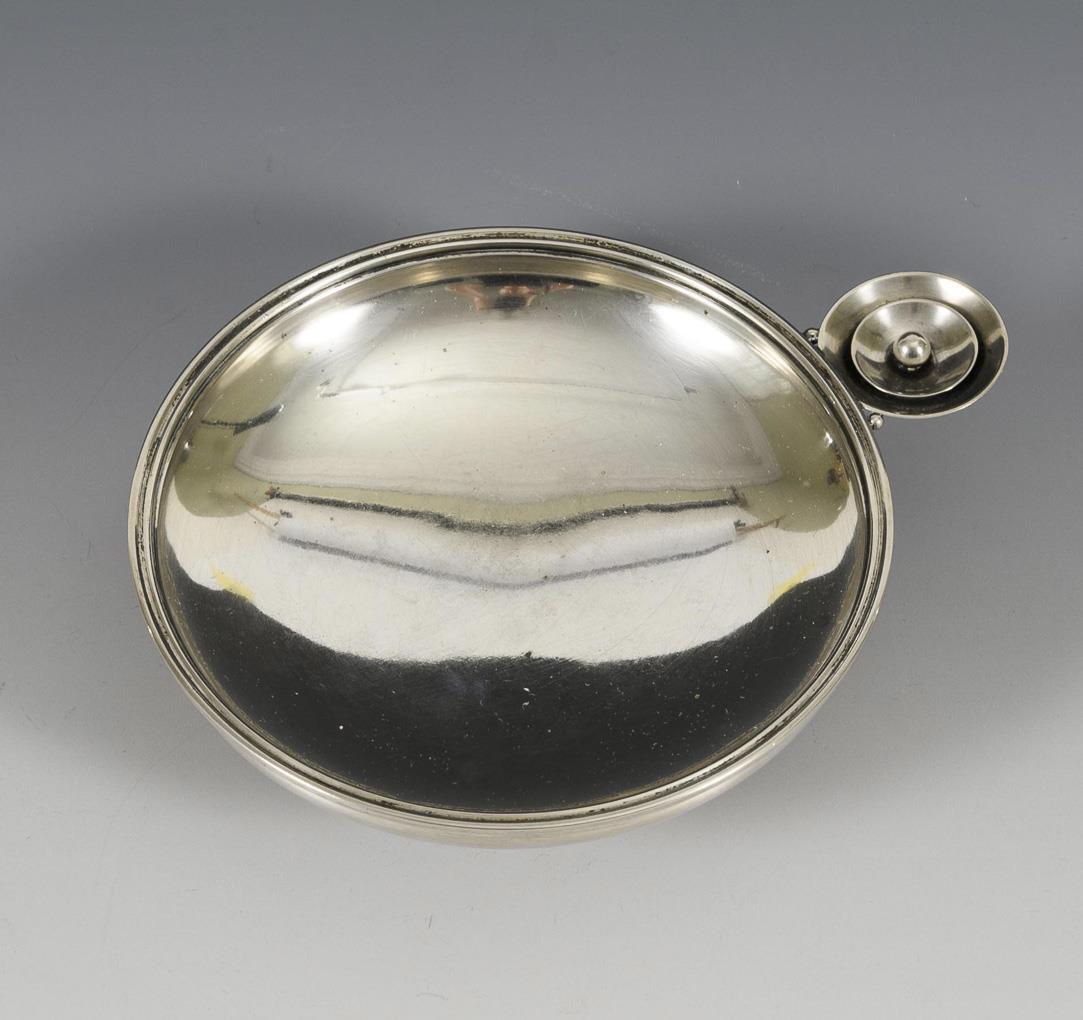 Rundes Silberschälchen mit kreisförmigem Griff. Kleine Dellen im Spiegel.