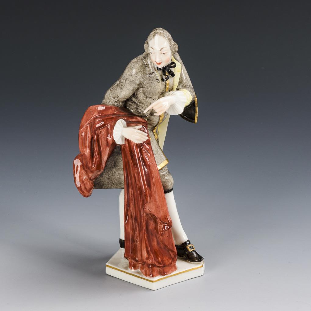 Stehender, einen roten Mantel tragender Rokokoherr.