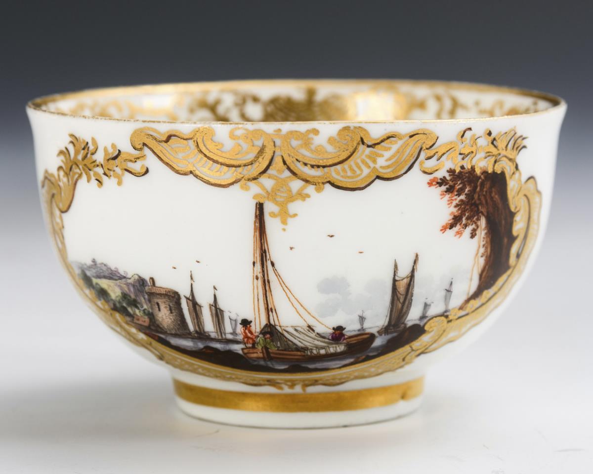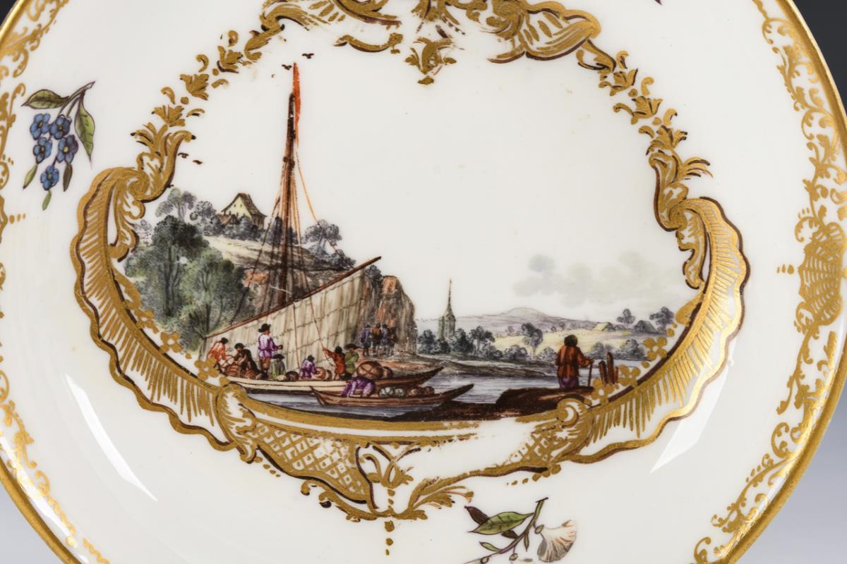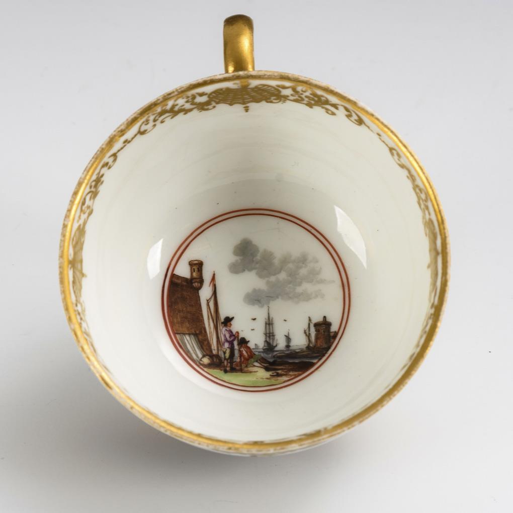 In goldrocaillegerahmten Kartuschen fein gemalte Küstenszenen mit Kauffleuten und Segelschiffen mit Warenladungen. Minimale Bestoßung am Standring der Untertasse.