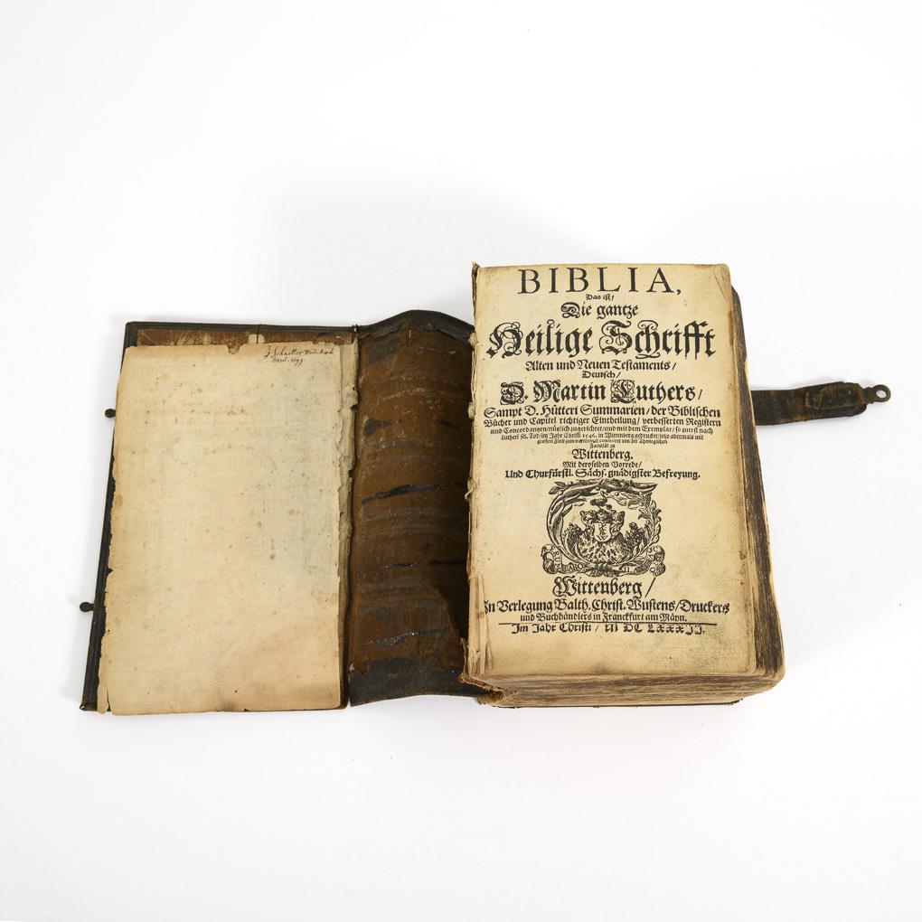Bibel in deutscher Sprache, zweispaltig gesetzt mit diversen Kupfern, Tafeln und Karten. Loser Titelkupfer von 1661, signiert von C.A.Böckler. Seltene Oktavausgabe u.a. mit dem Porträts der sächsischen Herzöge auf dem Widmungsblatt. Rücken und Einband aus Leder lose, Titelkupfer lose, Block fest. Stärkere Alters- und Gebrauchsspuren, eine Schließe vorhanden.