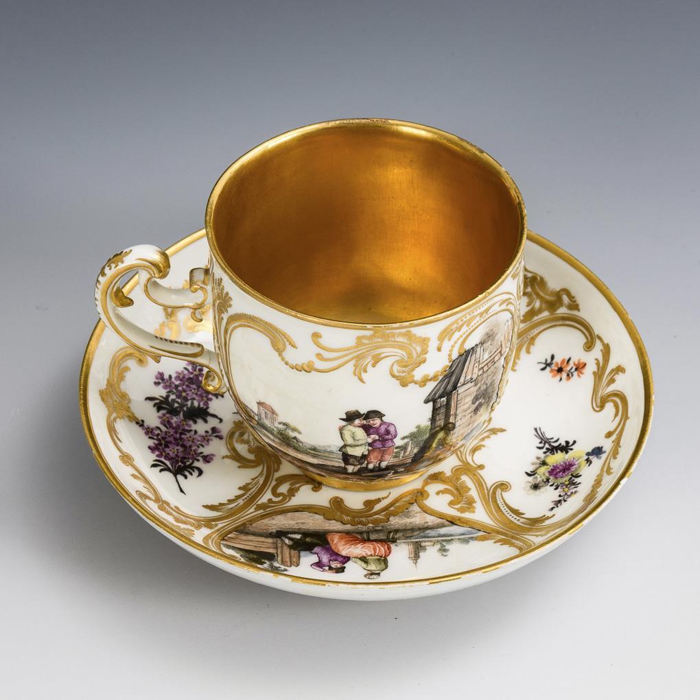 Polychrom bemalt, reich goldstaffiert. Tasse (H 6,5 cm), Untertasse (Ø 13,5 cm.