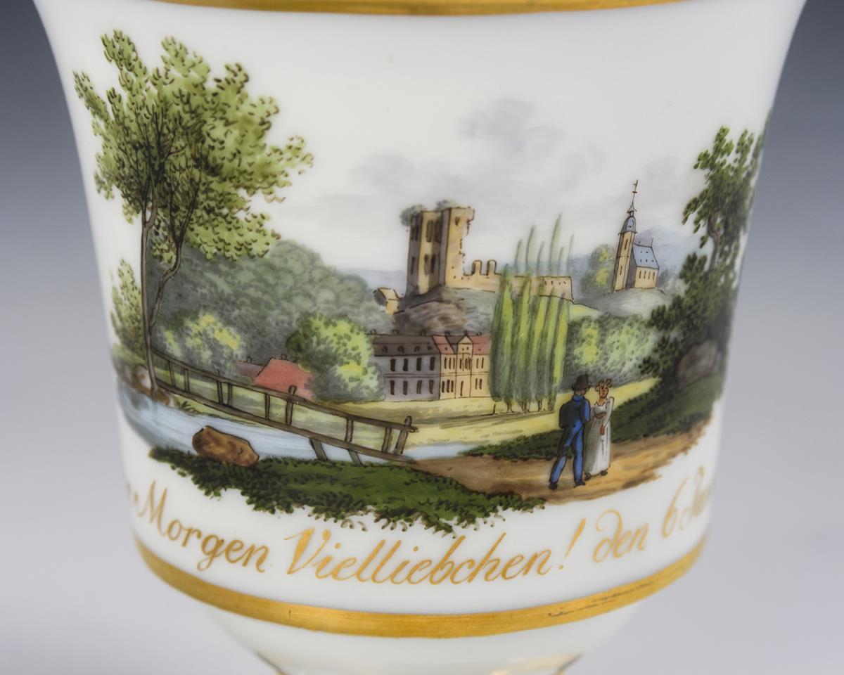 Gefußte Kratertasse mit Palmettenhenkel. Schauseitig die Darstellung einer Landschaft mit einem Paar, darunter die Bezeichnung "Guten Morgen Vielliebchen! den 6. Januar 1826.".
