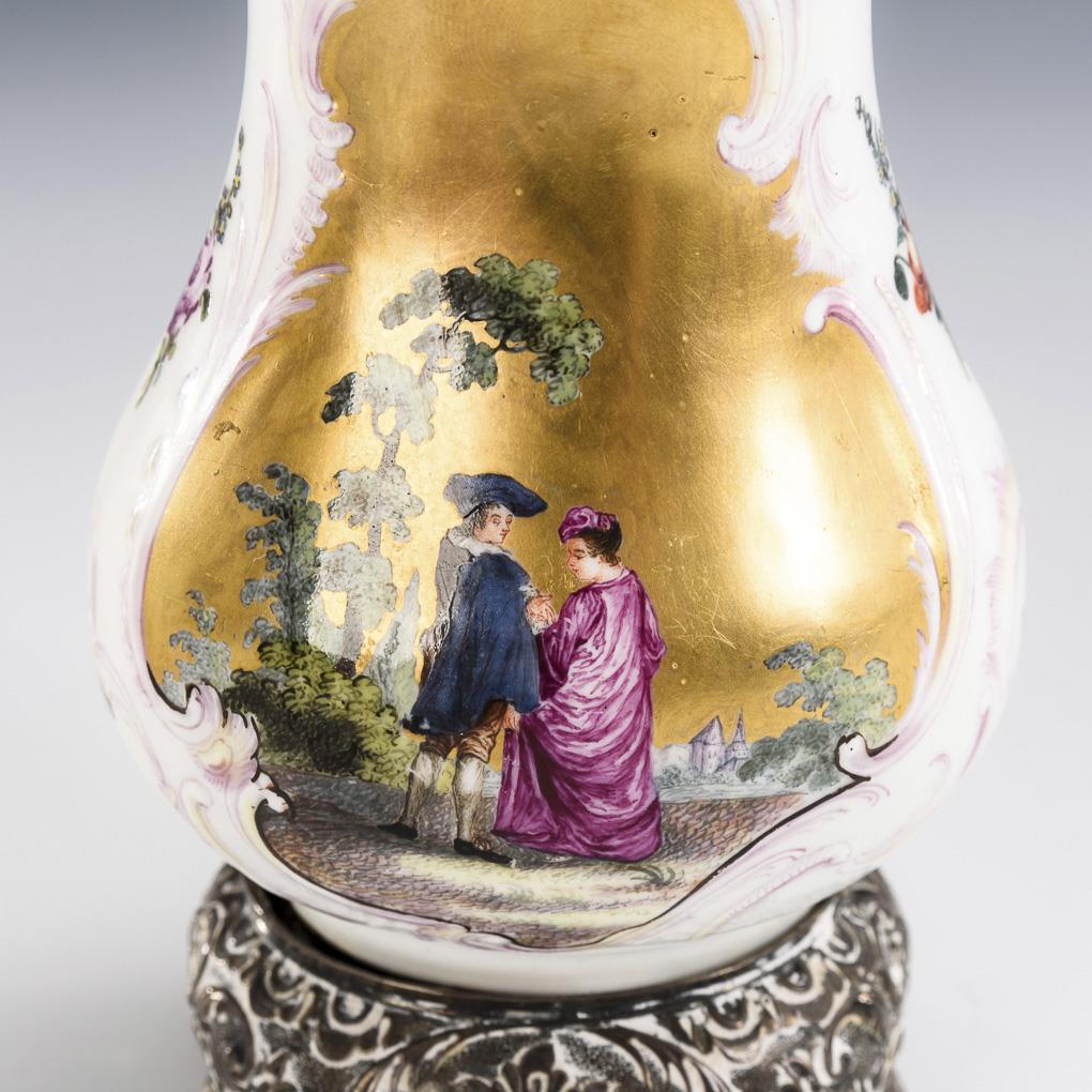 Balusterdose mit Rocaillereliefkartuschen, darin jeweils Goldfond mit einer polychromen Watteau-Szene, jüngerer, silbermontierter, rocaillereliefierter Stand (bezeichnet "Fine Silver") und Deckel.