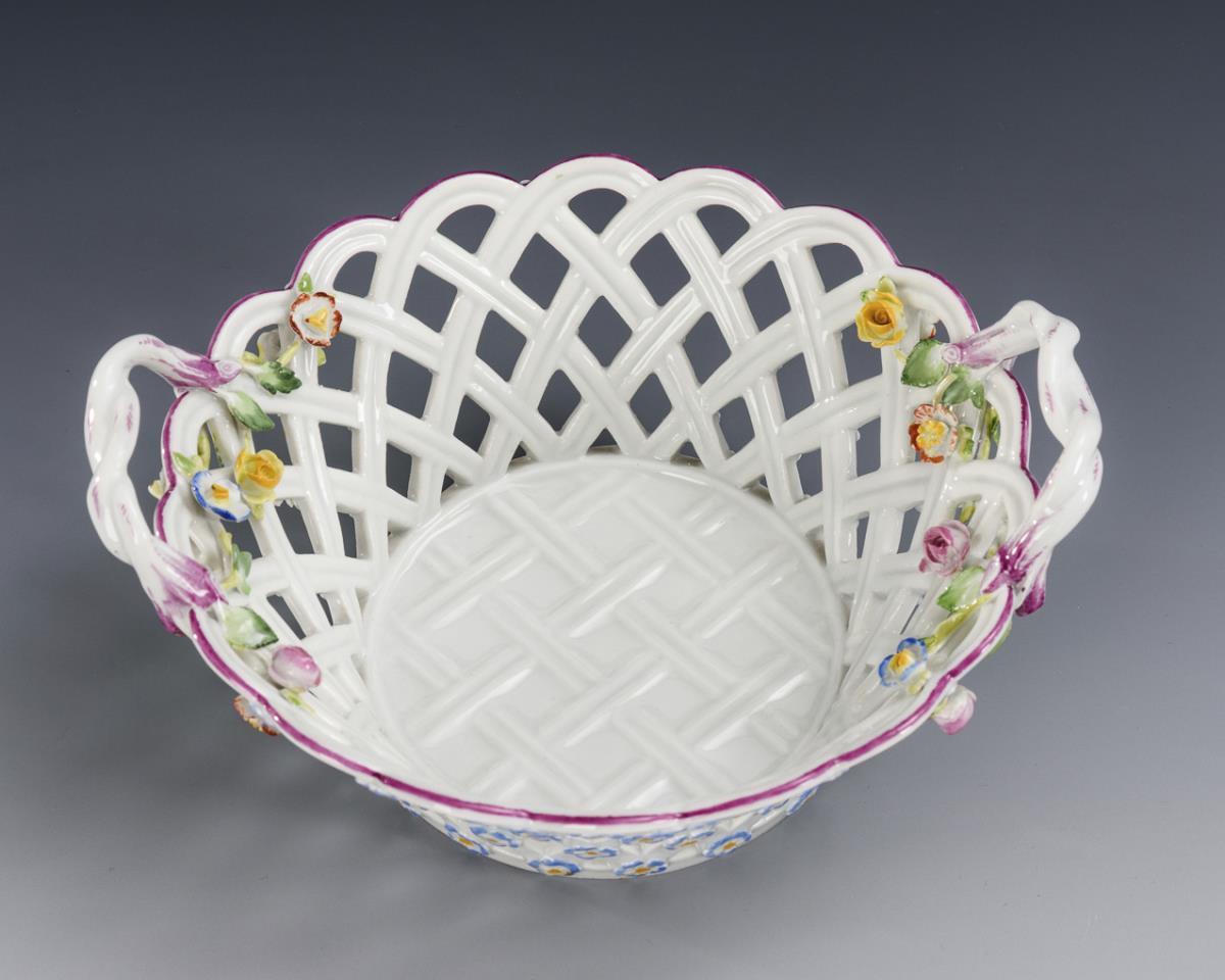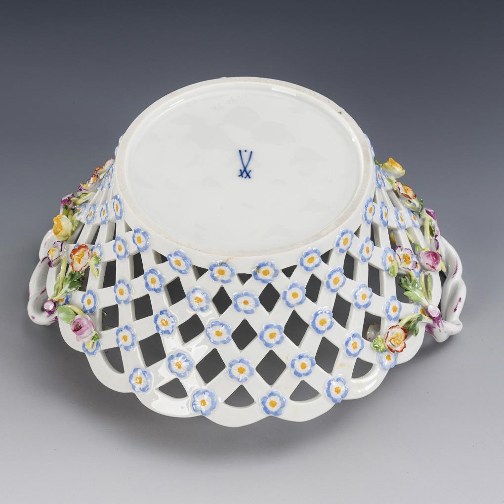 Korb mit zwei in Blüten auslaufenden Asthenkeln und Vergißmeinnichtblüten auf der Wandung.