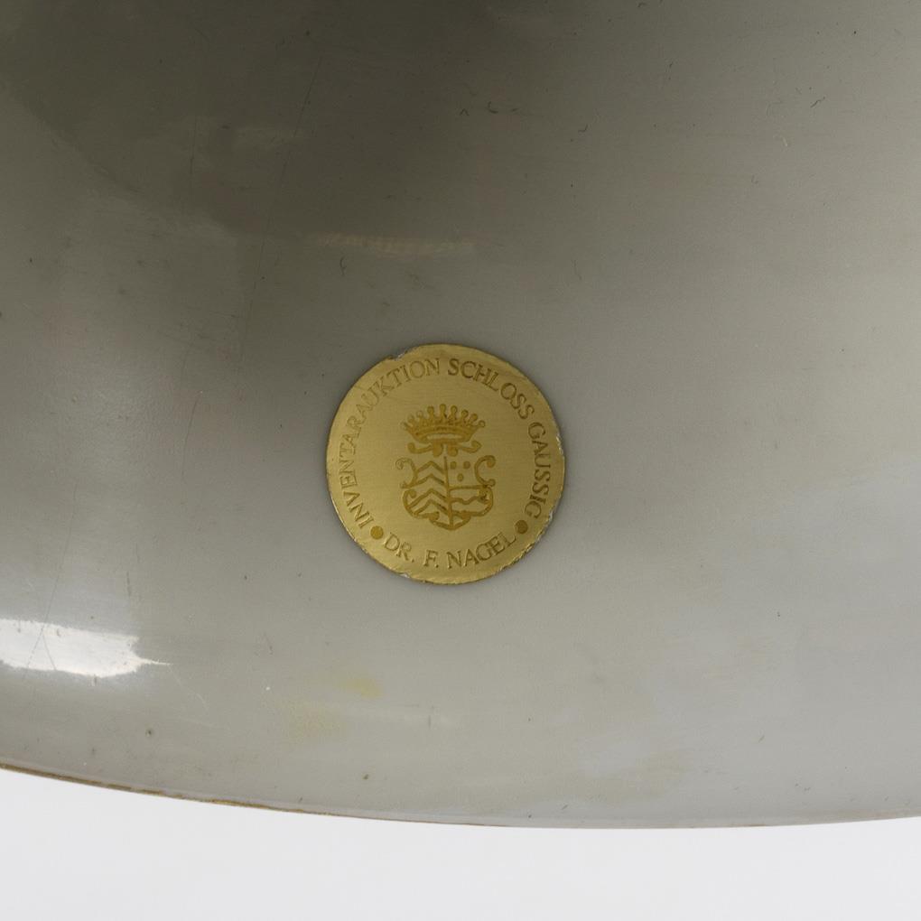 Polychrom bemalt, goldstaffiert. H 8,5 cm, Ø 17,5 cm.