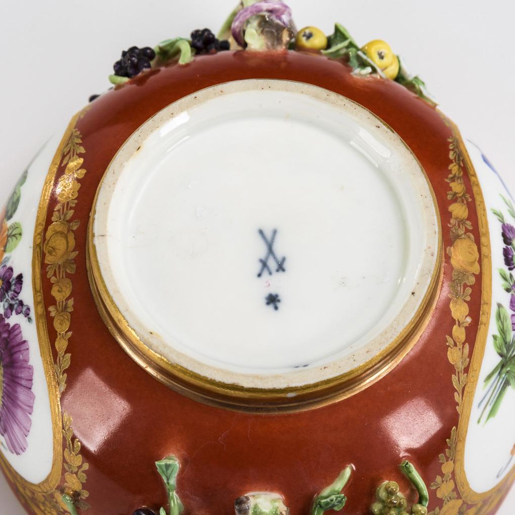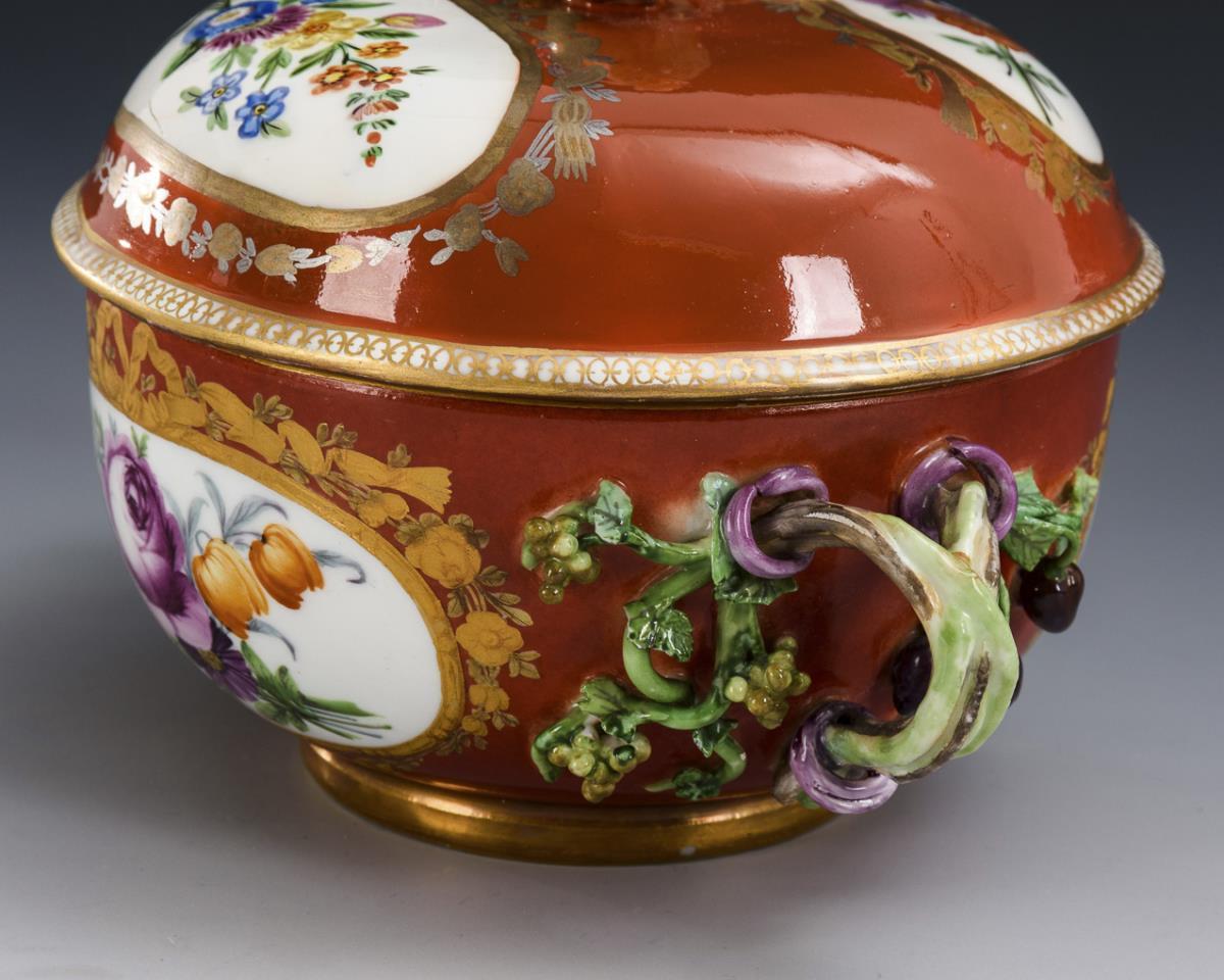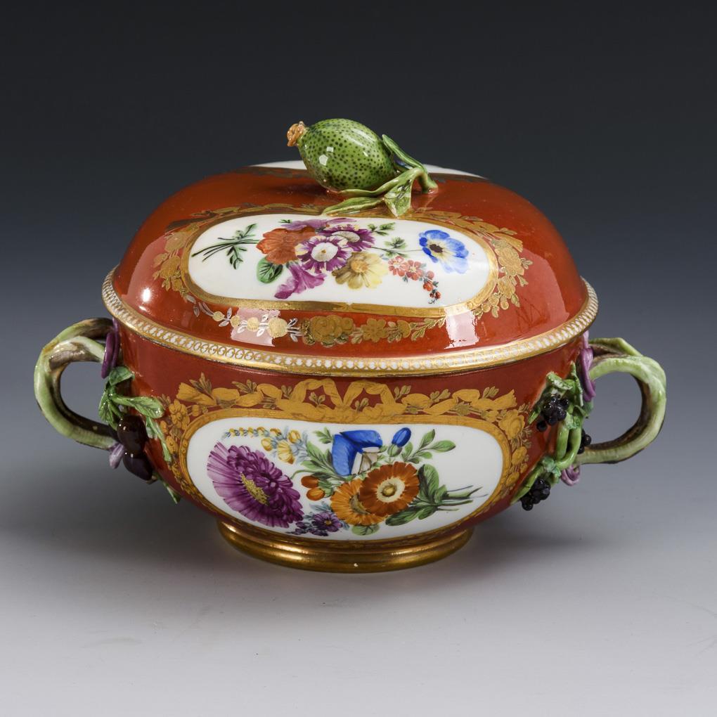 Bauchige Terrine mit zwei Fruchtzweighenkeln und Fruchtknaufdeckel. Rostroter Fond, in floral gold- und silbergerahmten Ovalkartuschen Blumenbuketts. Blätter bestoßen, beide Henkelansätze und Deckel restauriert.