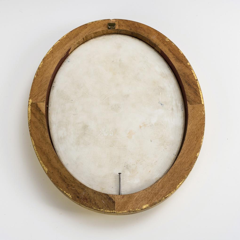 Polychrome Malerei. L 24,5 cm, im goldbronzierten Holzrahmen (L 28,5 cm).