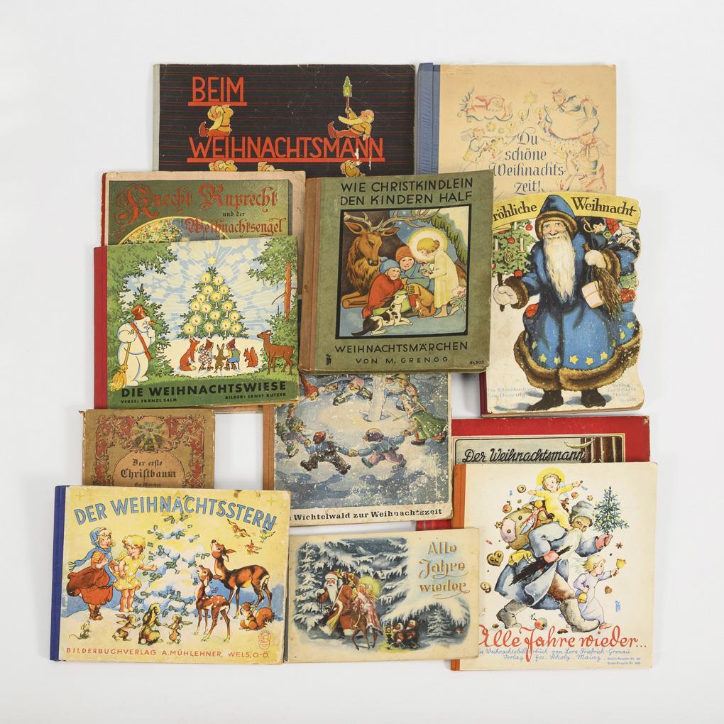 Lia Doering: "Fröhliche Weihnachten", Hartpappe mit geschwungenen Rändern. / Grengg: "Wie Christkindlein den Kindern half - Weihnachtsmärchen". / Friedrich-Gronau: "Alle Jahre wieder ...", in Sütterlinschrift. Alle aus dem Verlag Jos. Scholz, Mainz. / Huwe; Ponickau: "Im Wichtelwald zur Weihnachtszeit", Verlag Bischof & Klein, Lengerich. / Eiger: "Der Weihnachtsmann", Rhein-Nahe-Verlag 1946. / Viehrig; Scharf: "Du schöne Weihnachtszeit", Carl Marhold Verlagsbuchhandlung, Halle. / Schuster: "Beim Weihnachtsmann", Verlag Förster & Borries, Zwickau, Broschur. / Ebeling; Hohneck: "Knecht Ruprecht und der Weihnachtsengel", Märchenspiel, Meinhold & Söhne, Dresden. Broschur. / "Der Weihnachtsstern", Bilderbuchverlag a. Mühlener, Wels O.-Ö. / Salm; Kutzer: "Die Weihnachtswiese", Verlagsbuchhandlung Julius Breitschopf, Wien. / Frömke: "Alle Jahre wieder", Verlag Bitter & Co. Recklinghausen (1948), Broschur. / Gerstäcker: "Der erste Christbaum", ein Märchen. Verlag Hermann Costenoble, Jena und Leipzig. Alle mit Gebrauchsspuren.