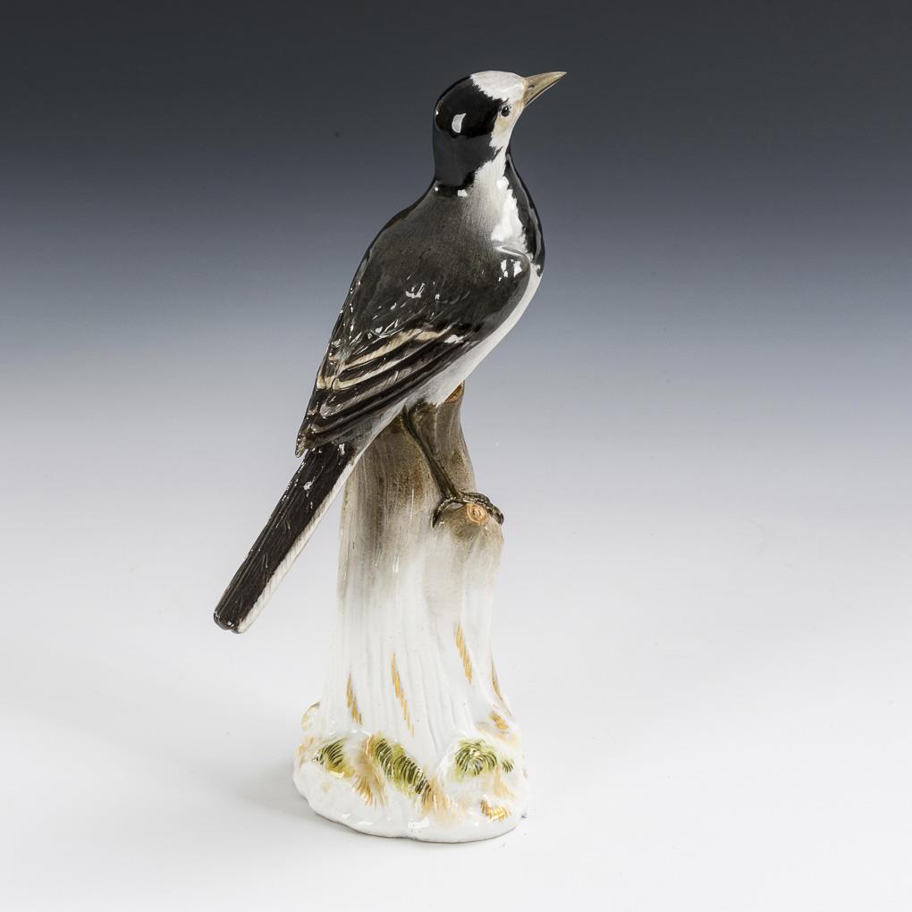 Auf einem Stamm sitzende Bachstelze. Schnabelspitze minimal restauriert.
