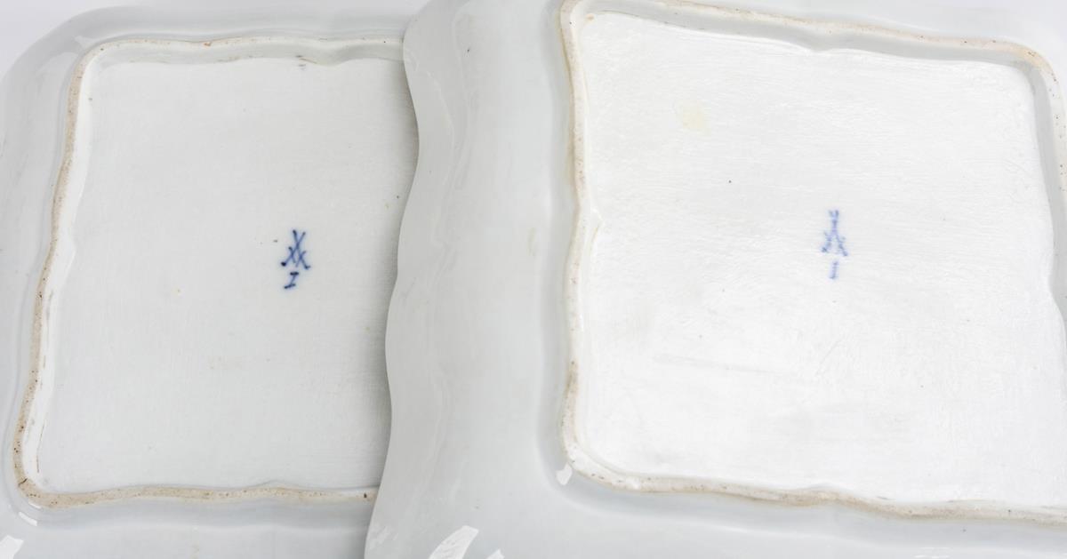 Polychrom bemalt, goldstaffiert. 2 Quadratschüsseln (22,5 x 22 und 22,5 x 23,5 cm).