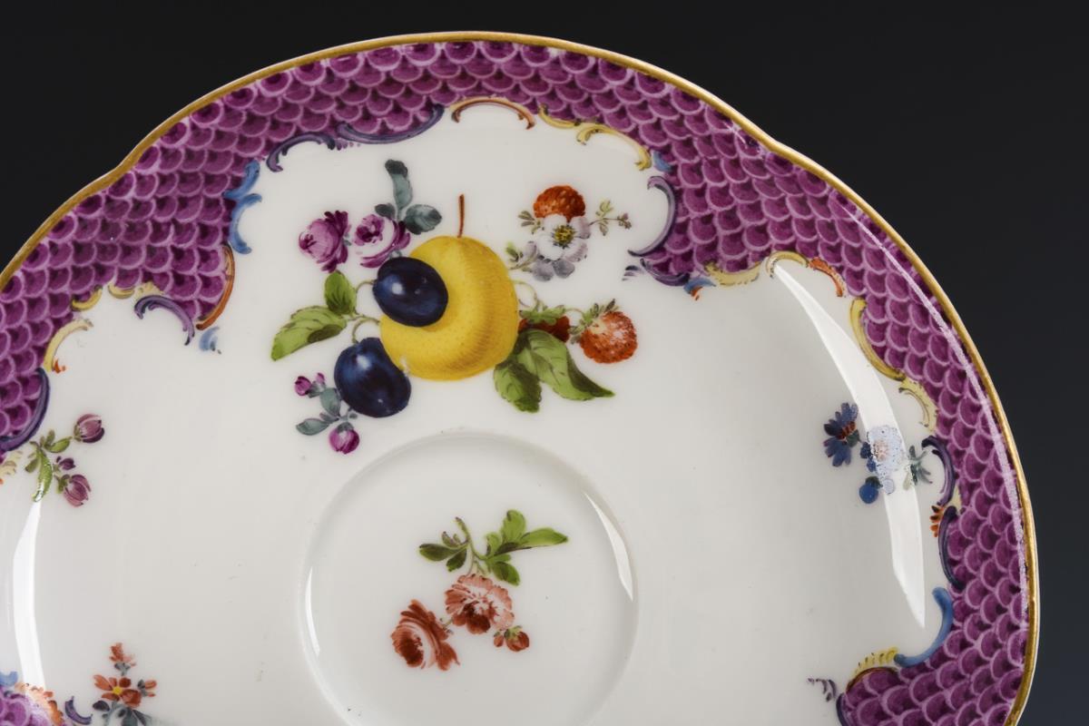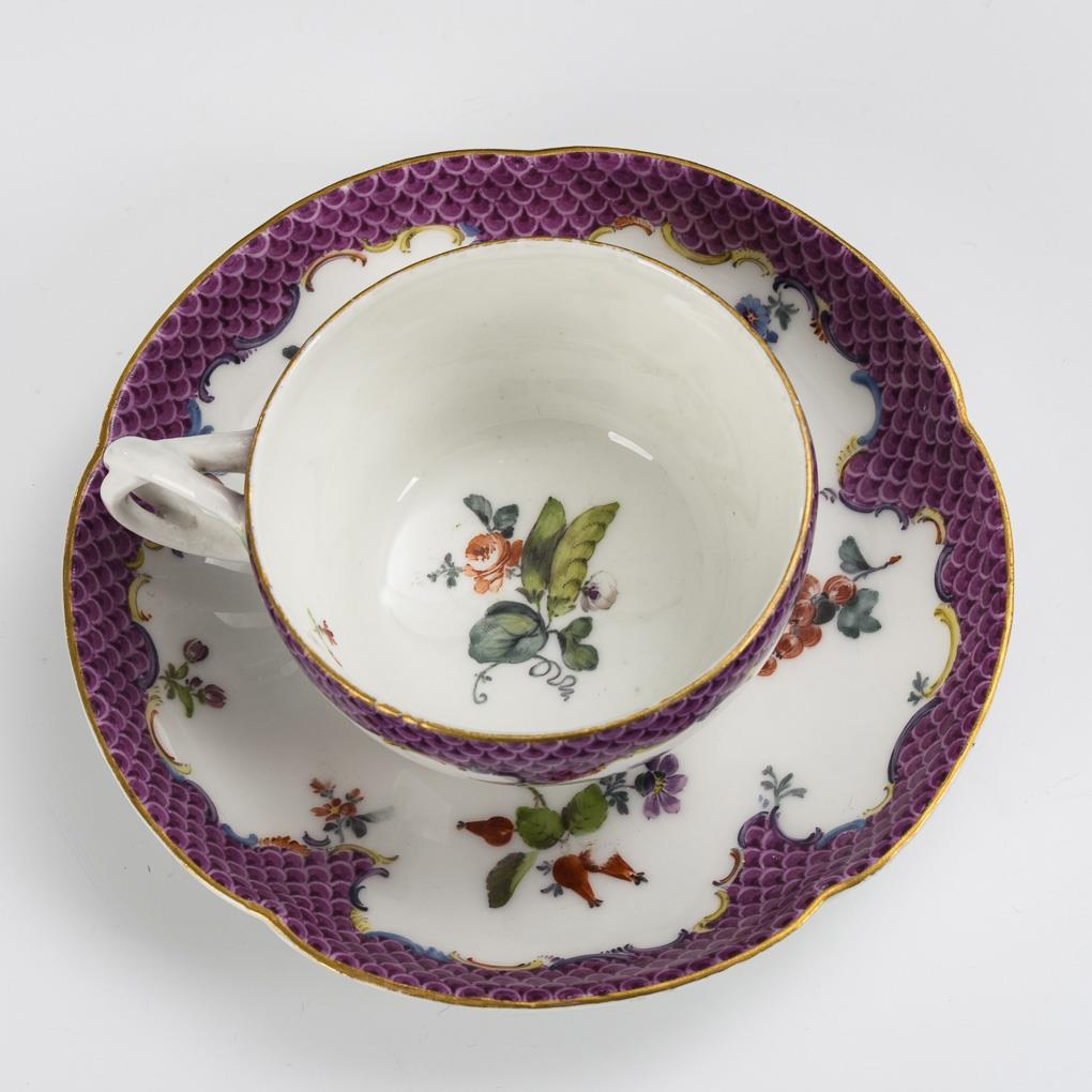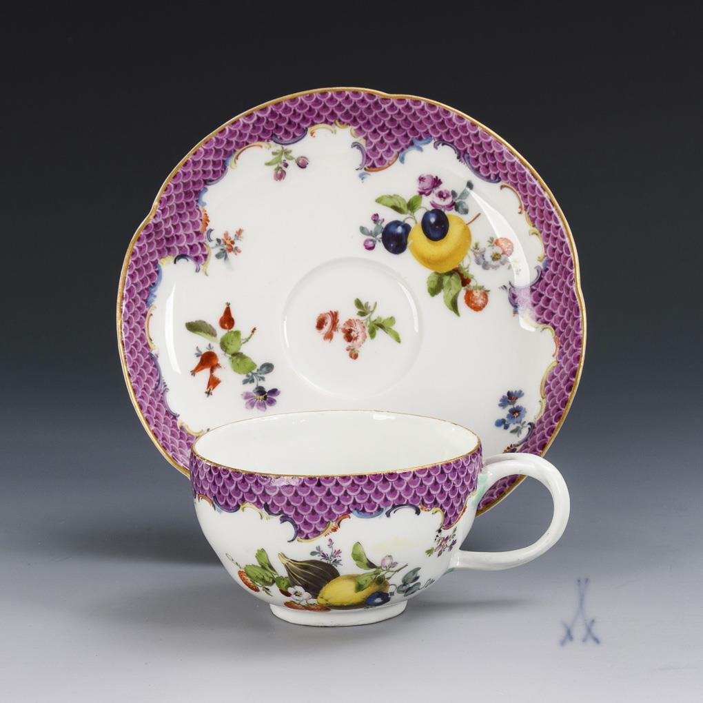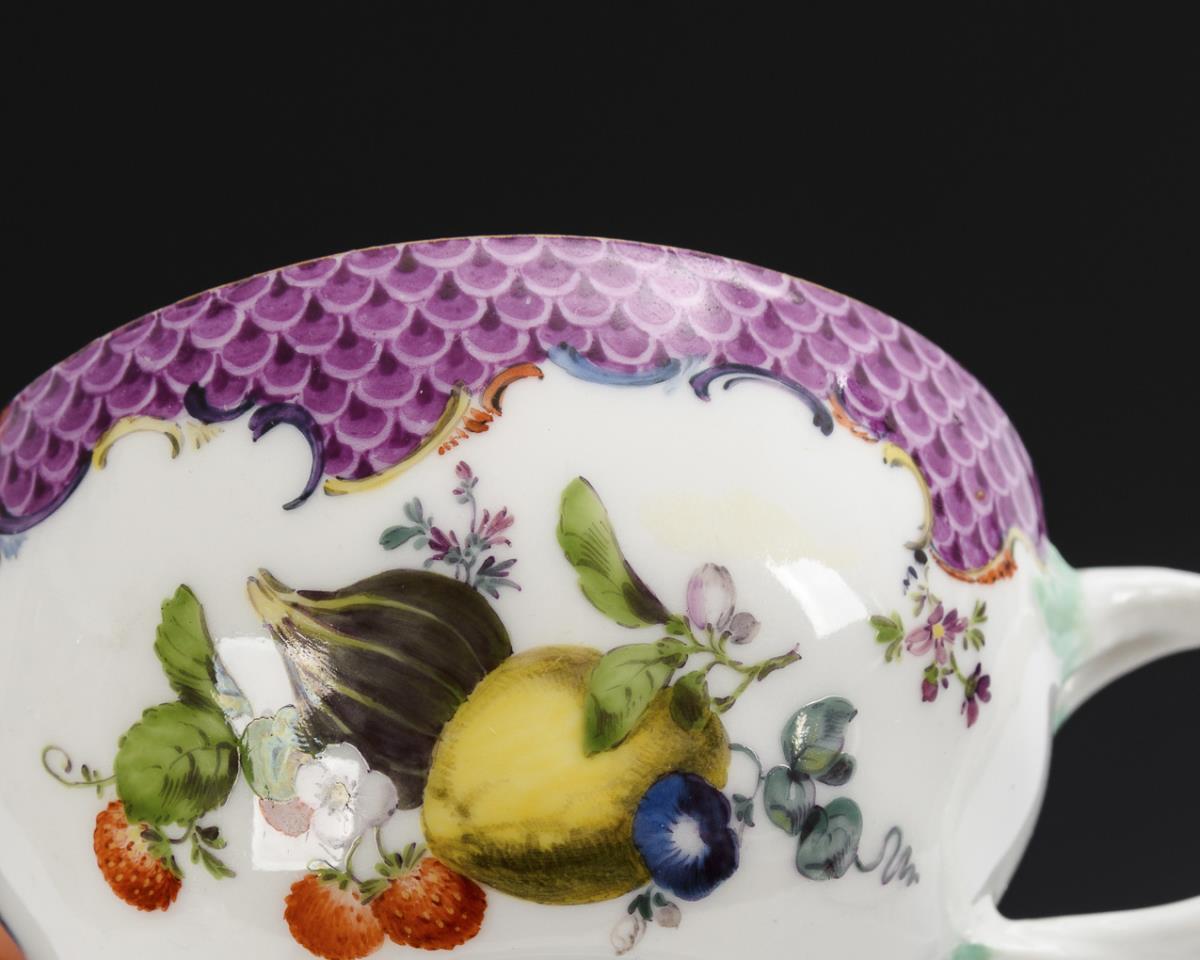 Bauchige Tasse mit gewundenem Asthenkel. Unter einer purpurfarbenen Schuppenbordüre Frucht- und Blumenbuketts. Minimaler Goldabrieb.