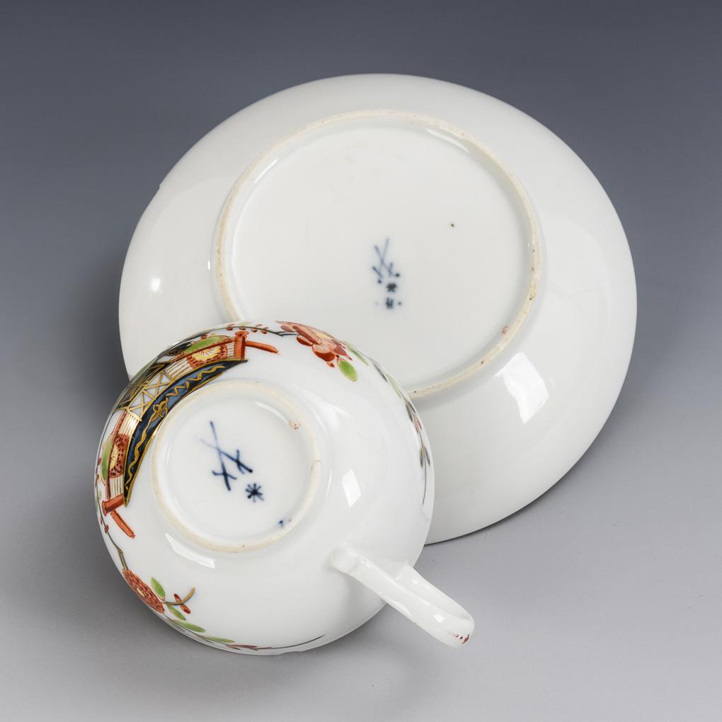 Unterglasurblaue Malerei, polychrome Aufglasurmalerei, Goldstaffage. H Tasse 4,5 cm, Ø originale Untertasse 13,5 cm.