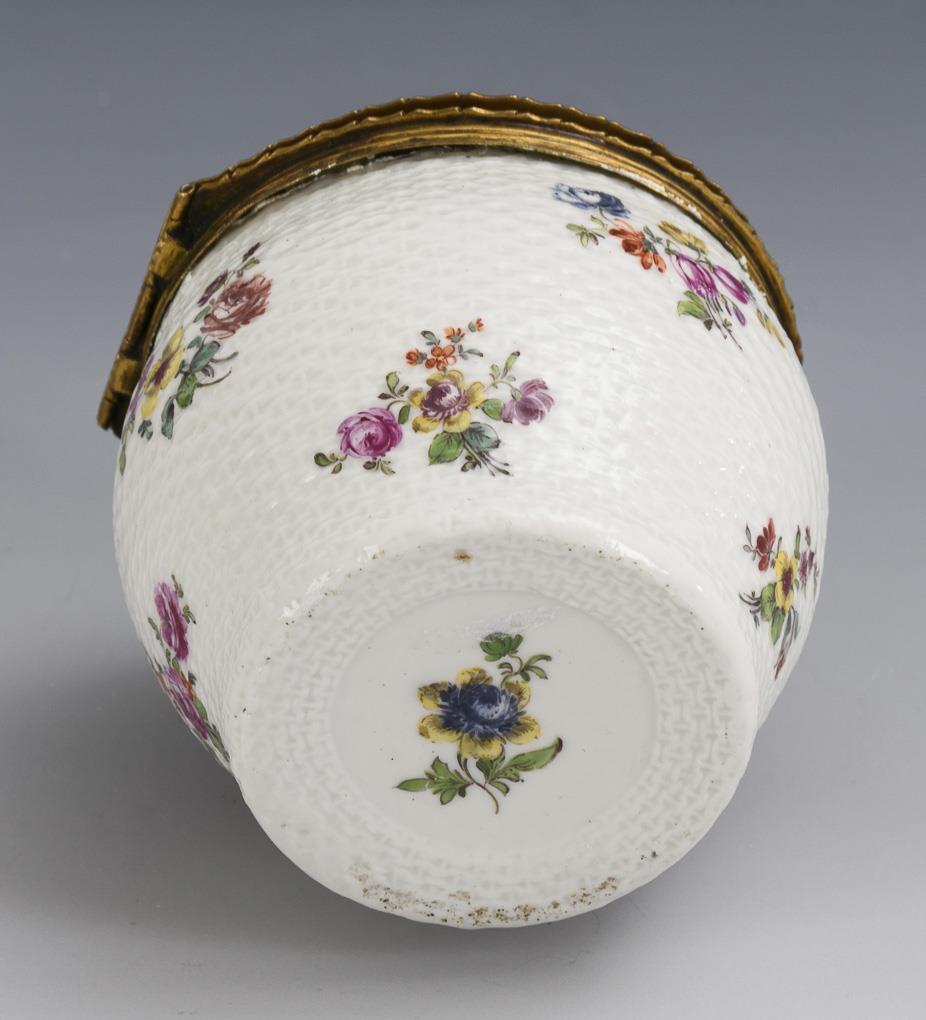 Als kleiner Korb gestaltete Dose mit messingmontiertem Scharnierdeckel. Auf der Deckelinnenseite ein Blumenbukett mit Rose und Mohn. Deckel restauriert.