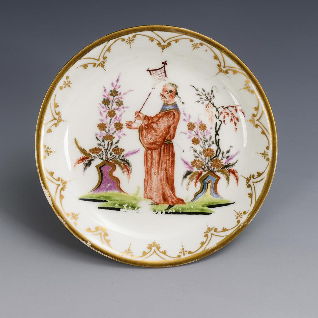 Im Spiegel die Darstellung eines zwischen Felsen und Blumen stehenden Chinesen mit Fächer, Malerei im Stil von Claudius du Paquier (1679-1751). Partiell etwas berieben, Bestoßung am Standring der Untertasse.