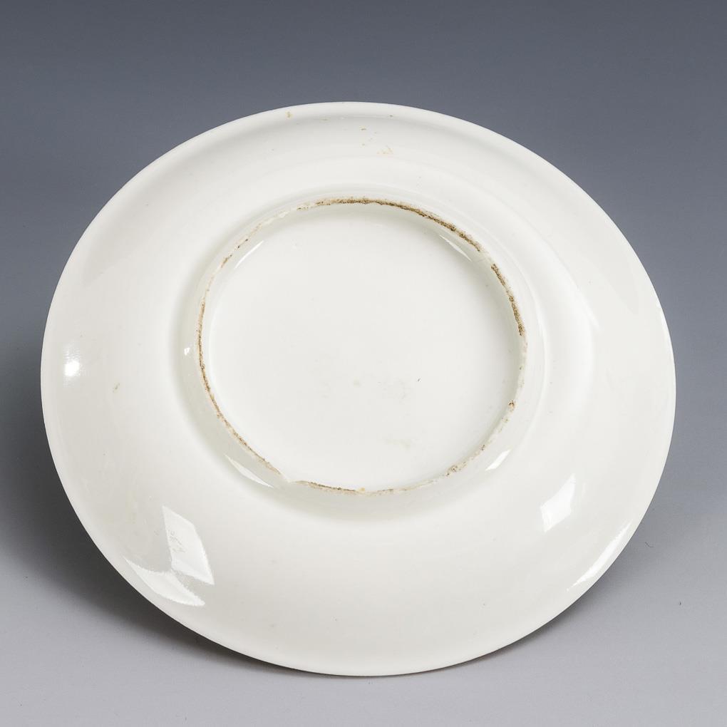 Im Spiegel die Darstellung eines zwischen Felsen und Blumen stehenden Chinesen mit Fächer, Malerei im Stil von Claudius du Paquier (1679-1751). Partiell etwas berieben, Bestoßung am Standring der Untertasse.