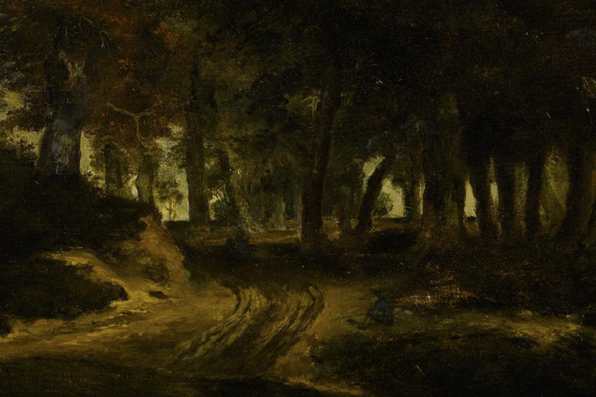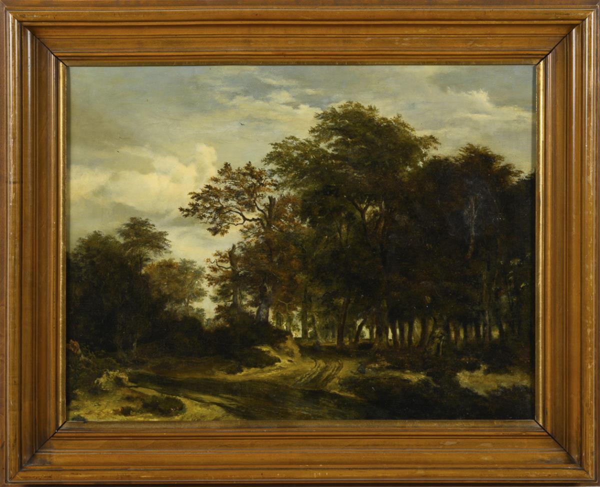 In der Art der Altmeister gemalte Landschaft mit seichtem Bach vor Eichen. Eine restaurierte Stelle mit Hinterklebung.