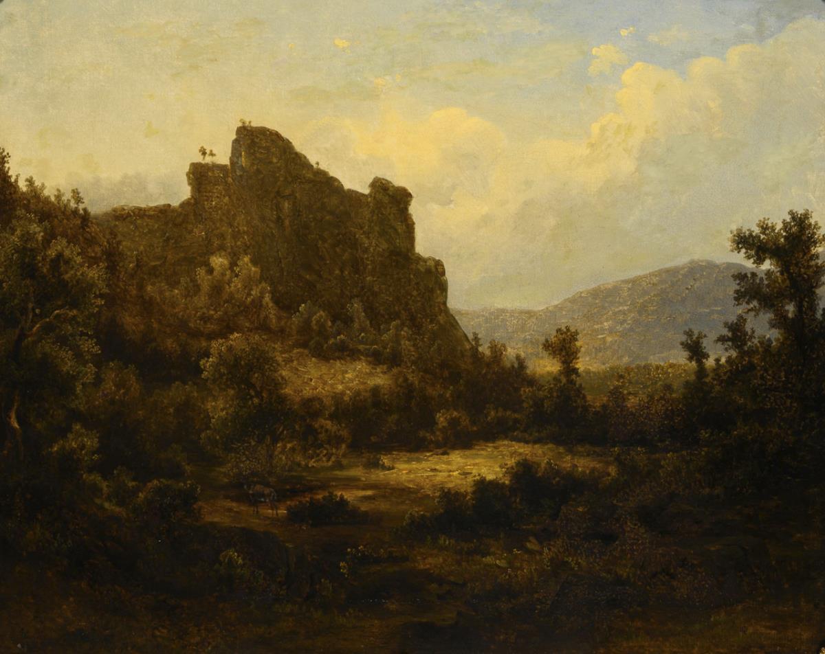 Lichte Waldlandschaft um steil aufragende Felsen unter wolkigem Himmel. Retuschiert.