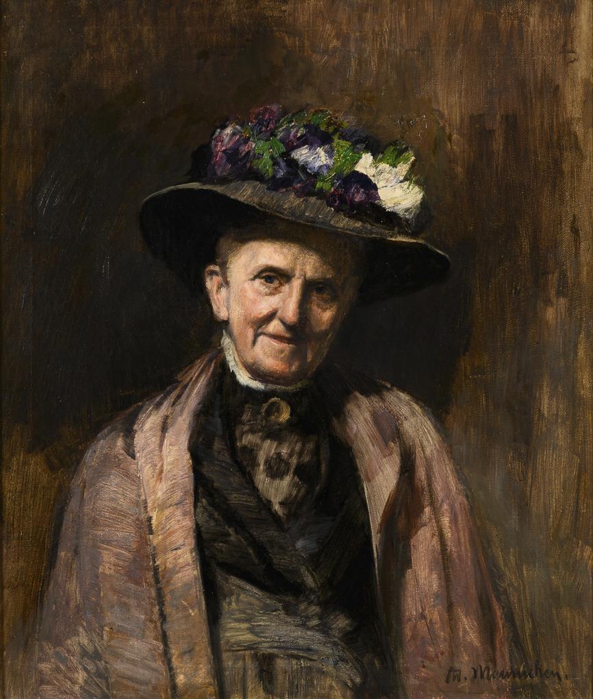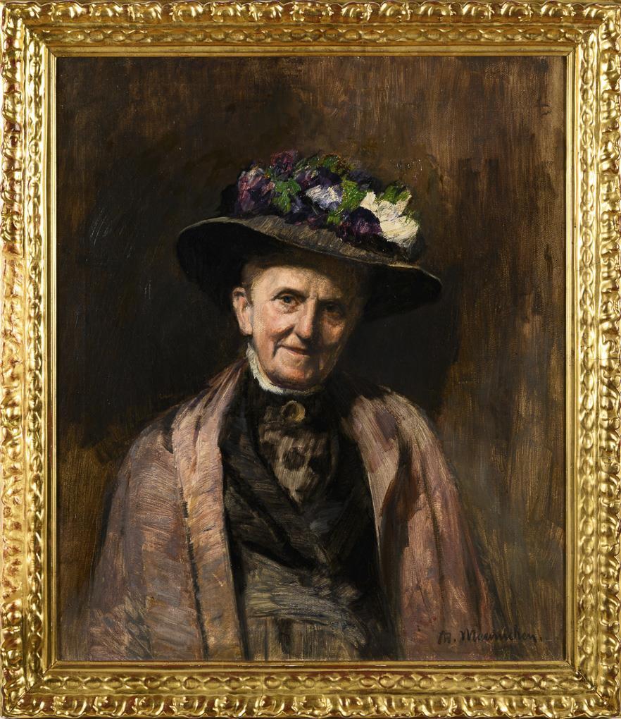 Porträt einer alten Frau mit Blumen besetztem Hut und in dunklem Kleid mit fliederfarbenem Mantel. Minimale Altersspuren.