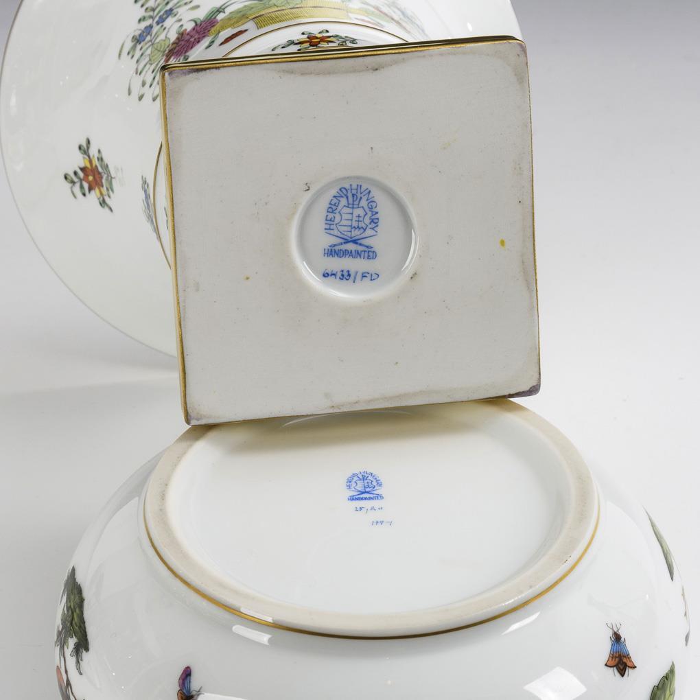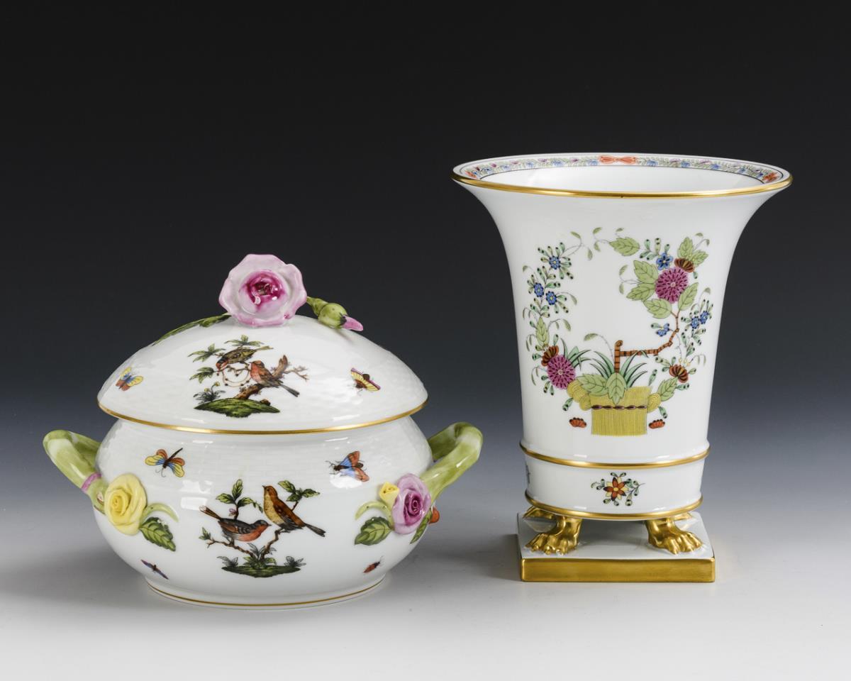 Kleine Terrine mit Altozierrelief, Rothschilddekor unnd Blütenbelag. / Kratervase mit vier Tatzenfüßen und Kakiemondekor.