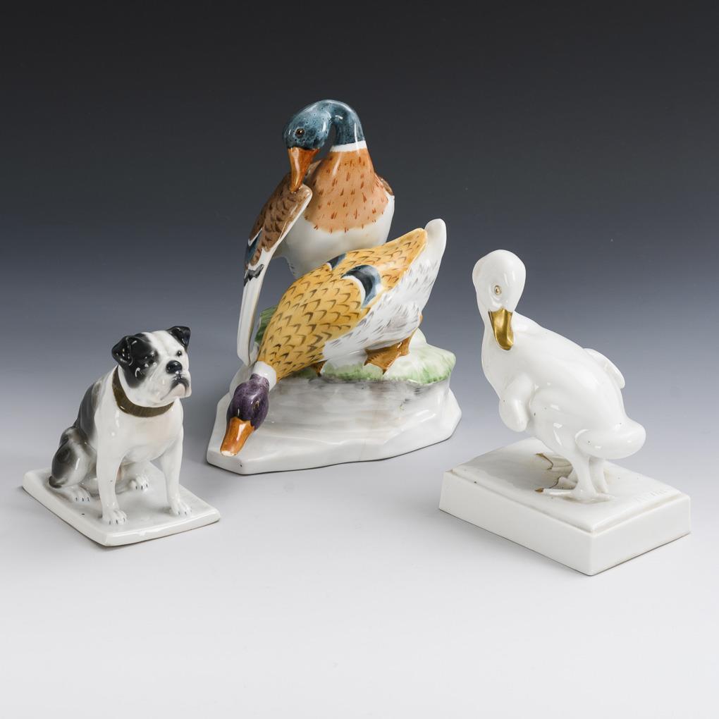 1x TEICHERT, um 1900, Modell-Nr. 408: Entenpaar auf einem Natursockel (H 18 cm). / 2x FRAUREUTH, um 1920: Entenküken auf Rechtecksockel (H 13 cm) und sitzende Bulldogge (H 10,5 cm). Haarriss im Sockel des Entenpaares.