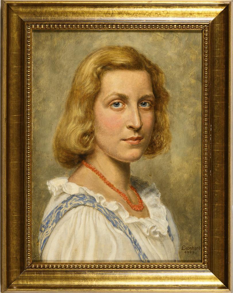 Bildnis einer jungen Frau im hellen Kleid mit Kette und blondem Haar.