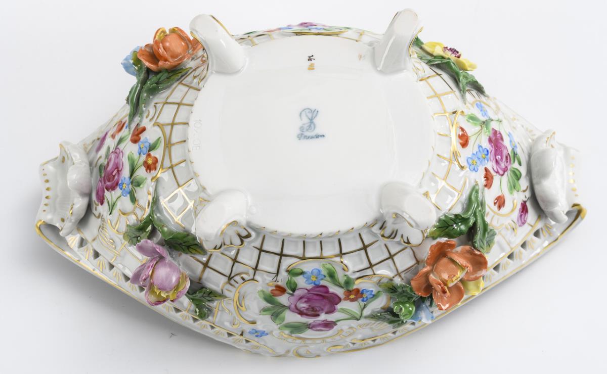 1 3-flammiger Leuchter und 2 1-flammige Leuchter mit Rocaillerelief und Blütenbelag (H ca. 17 cm). / 1 ovale Schale mit vier Füßen, durchbrochenem Rand und Blütenbelag. 2 Blütenblätter bestoßen.