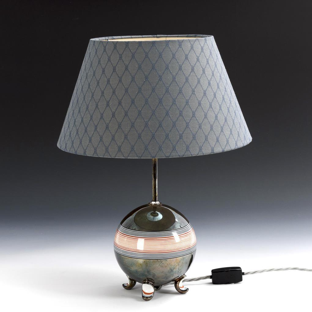 Kugelkorpus mit drei Füßen, Streifendekor und Silberoverlay, ergänzter, konischer Schirm. Neu elektrifiziert (Funktion nicht geprüft).