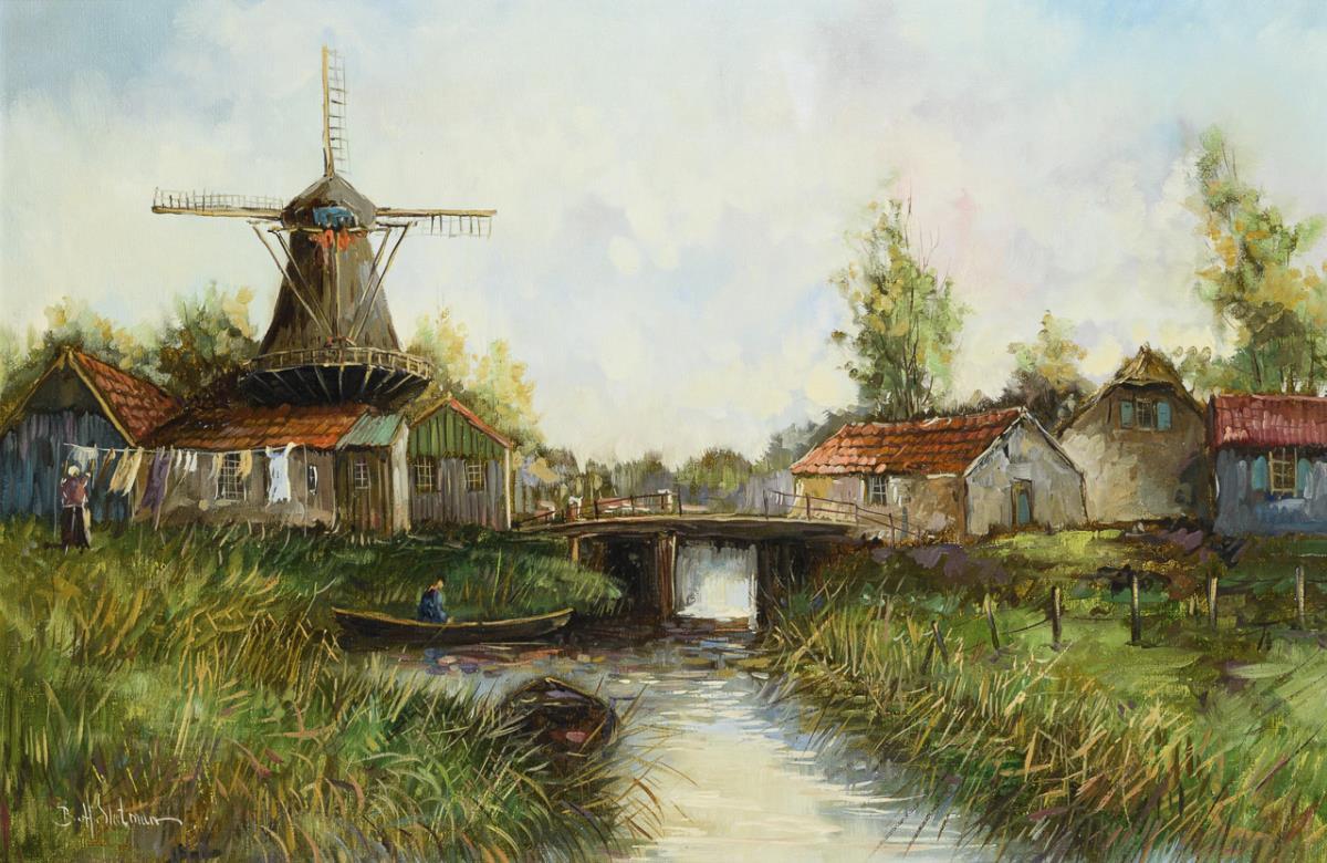 Ansicht eines Dorfes mit Windmühle, Kahnfahrer und Bäuerin beim Wäsche aufhängen.
