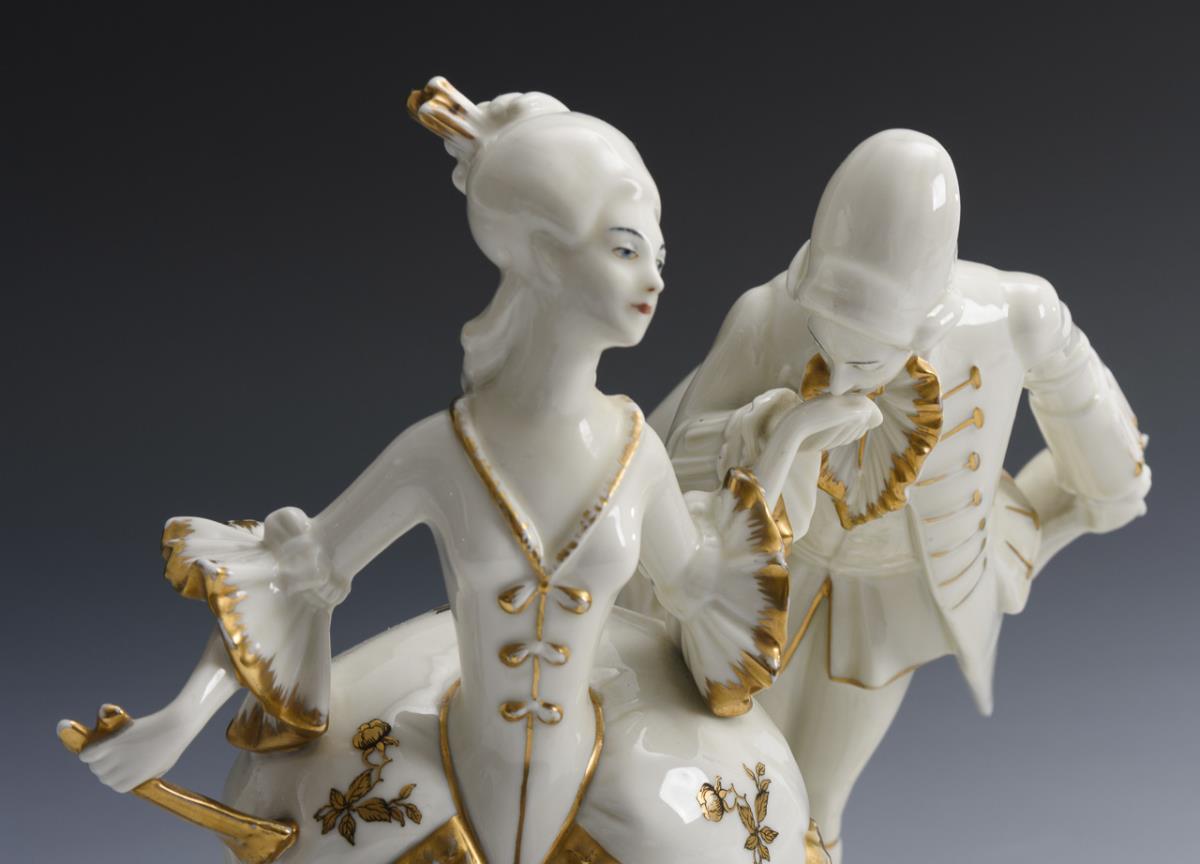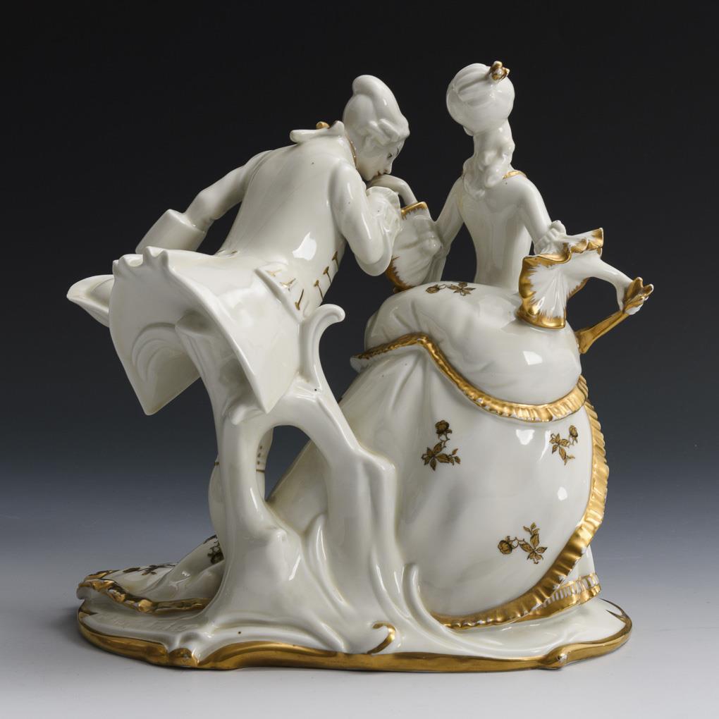 Stehende Rokokodame, einen Handkuss von einem Kavalier entgegennehmend. Minimaler Goldabrieb, Hals der Dame restauriert.