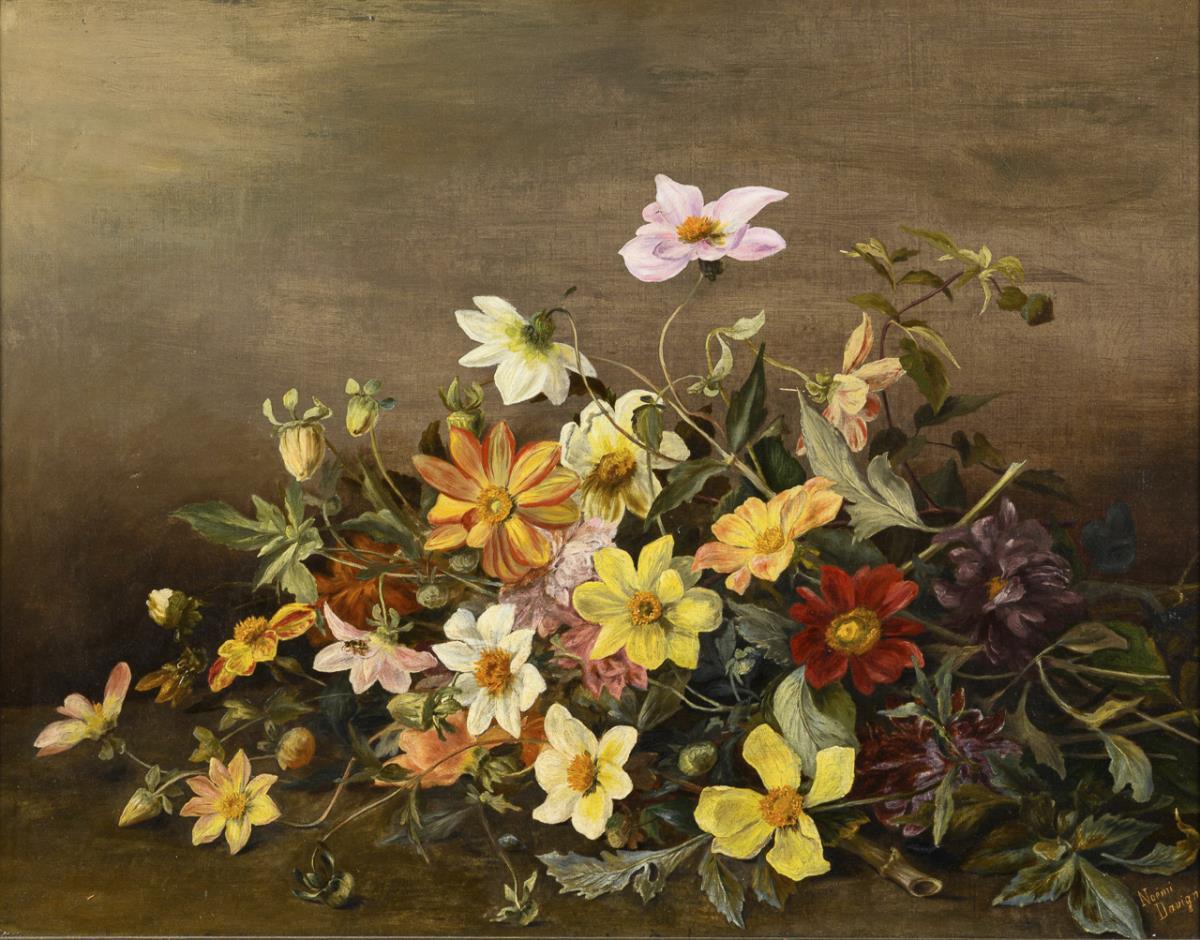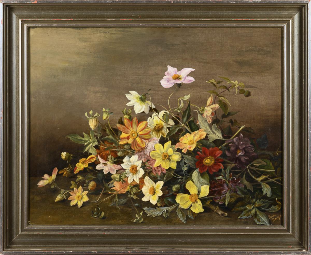 Liegender Blumenstrauß mit verschiedenfarbigen Blüten auf neutralem Grund. Kleine restaurierte Stellen mit Hinterklebungen.