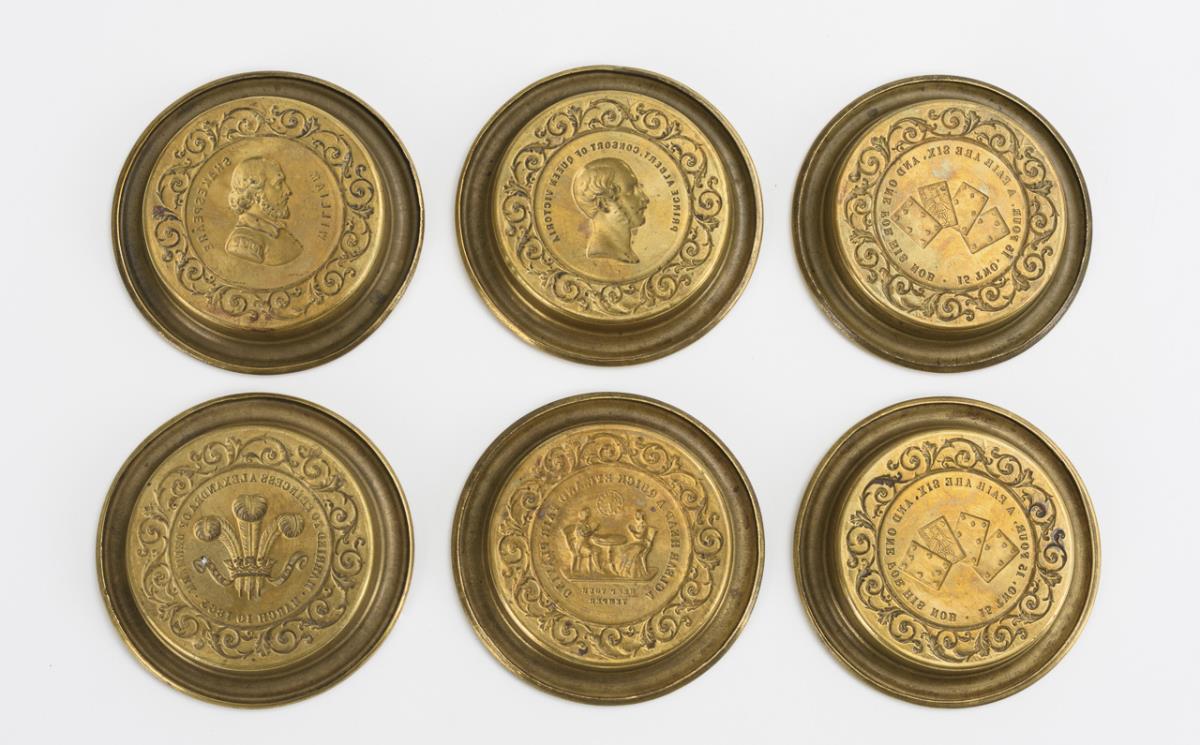 Gleich geformte kleine Schalen mit profiliertem Rand und englisch beschrifteten, zumeist verschiedenen Motiven: Karten spielendes Paar, Spielkarten, Krone mit Federn zur Hochzeit mit Alexandra von Dänemark 1863, Bildnis Prinz Albert bzw. Shakespeare. Minimale Alters-/Gebrauchsspuren, 1 Motiv doppelt.