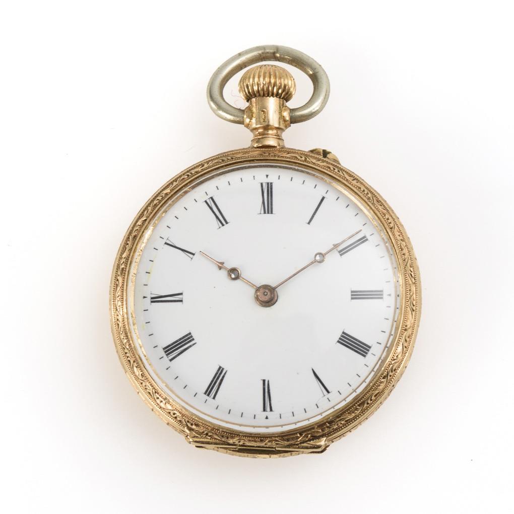 Fein ziseliertes Gehäuse, Rückdeckel mit ovaler Reserve und flankierenden Putten mit Rankenwerk. Zifferblatt mit leichten Kleberspuren, Bügel wohl ergänzt.