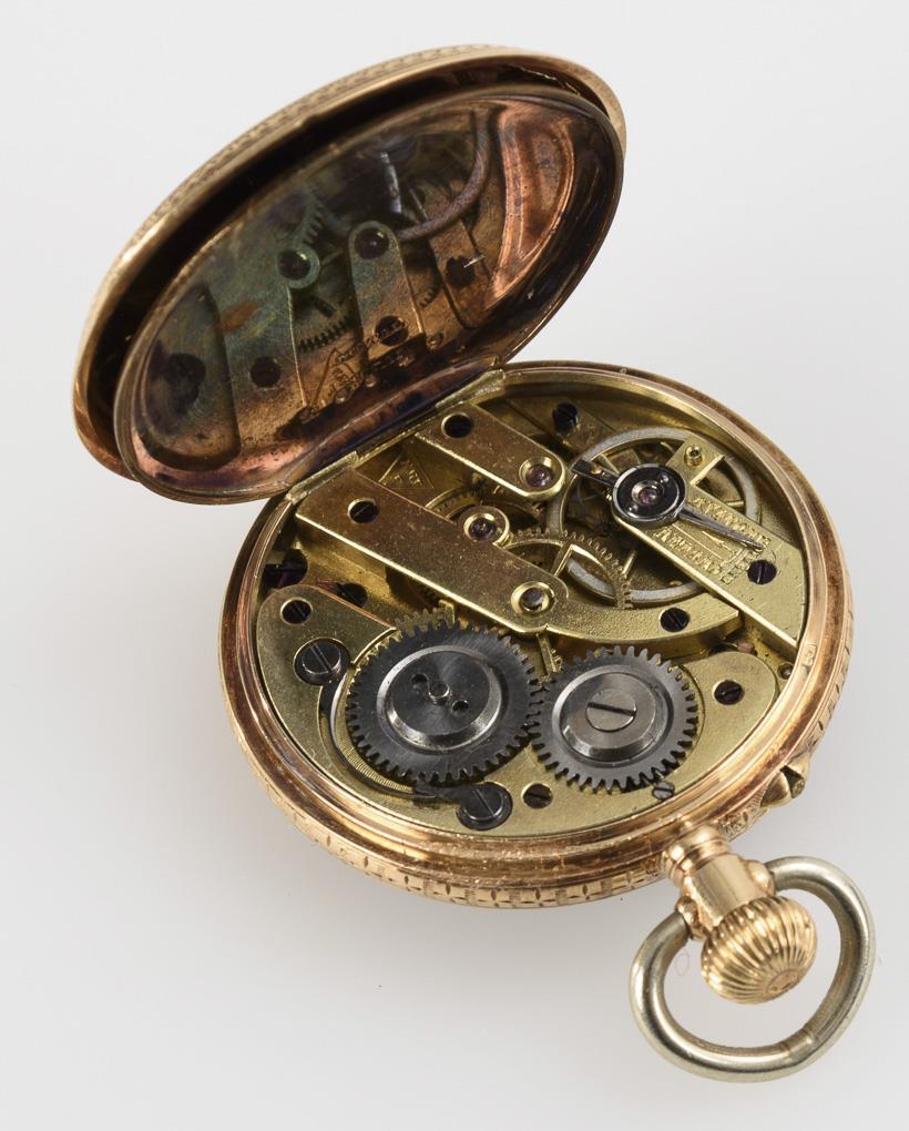Gemarktes Werk mit Zylinderhemmung, Reifenunruh, Steinen, Kronenaufzug. Läuft. Weißes Emailzifferblatt mit römischen Zahlen, Minutenkranz und Pfeilzeigern.