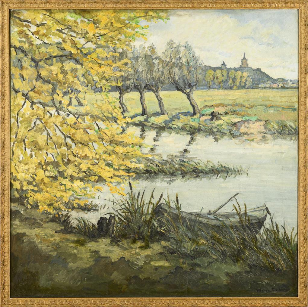 Herbstliche Landschaft mit Kahn am Flussufer nahe der Stadt weiter hinten unter bewölktem Himmel. Minimale Altersspuren.