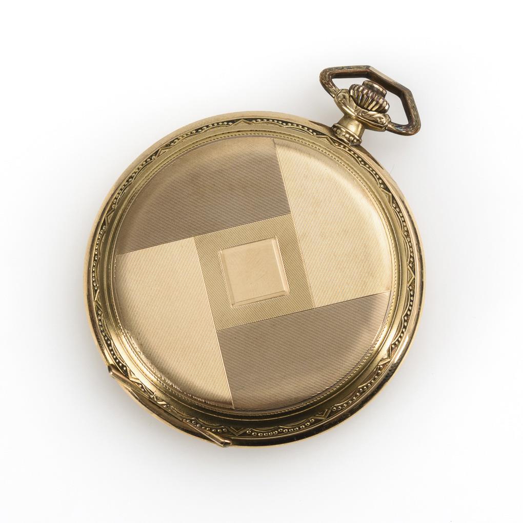 Geometrisch gemustertes Sprungdeckelgehäuse mit Reliefrand. Minimalste Gebrauchsspuren.