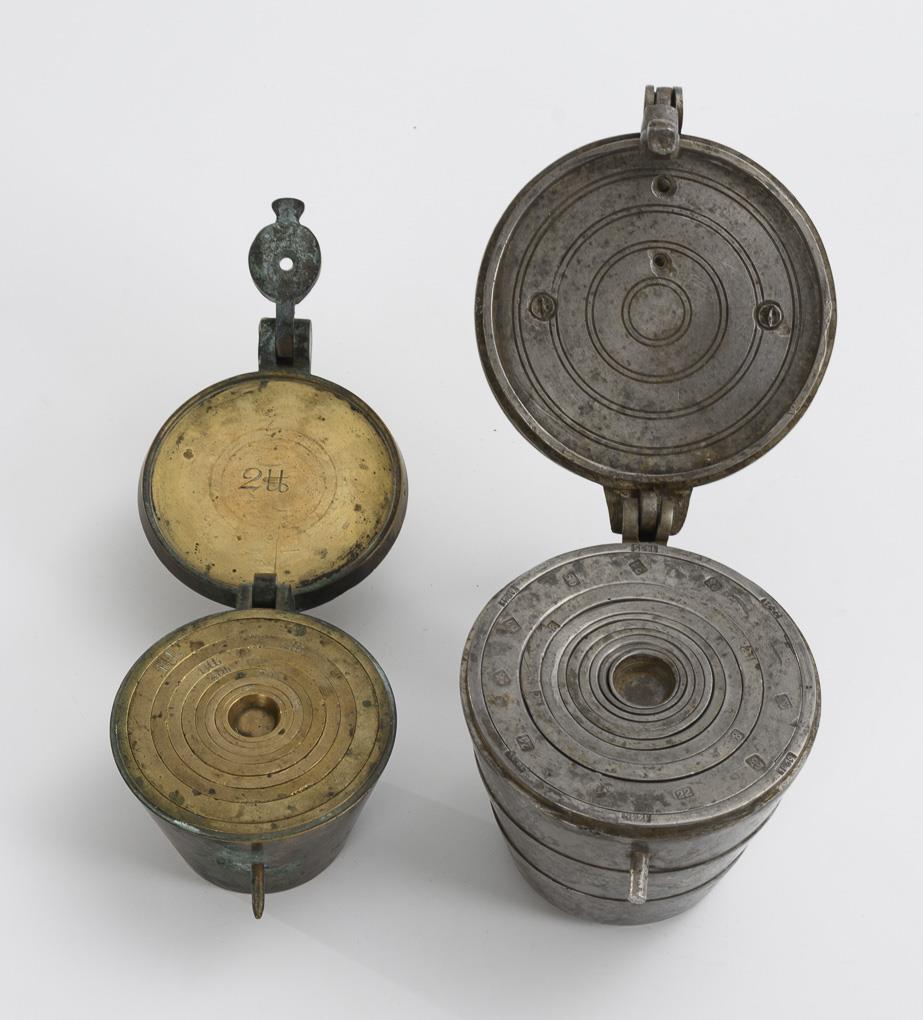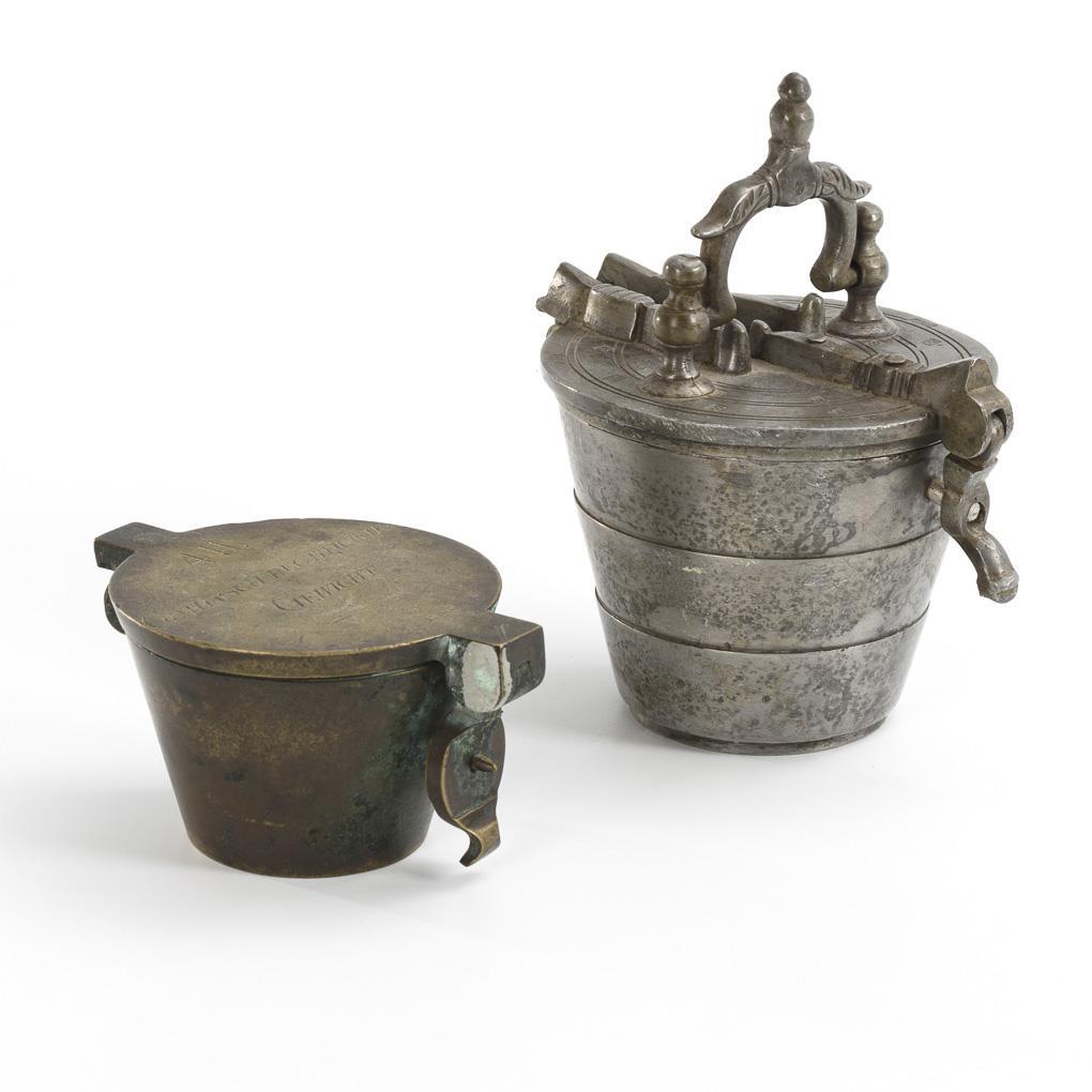 Bronzegewicht mit glatter Wandung und glattem Scharnierdeckel, hier Gravur "4 Pfund Gothaisch Rectificirtes Gewicht". Auf den Oberkanten der 8 vorhandenen "Bechergewichte" gravierte Bezeichnungen von 1 Quentchen bis 1 Pfund, im Deckel 2 Pfund. / Neueres Zinngewicht mit undeutlichen Punzen auf dem Deckel sowie zahlreiche, zumeist doppelte Jahrespunzen; diese teils auch auf den Oberkanten der 9 vorhandenen "Bechergewichte". Bronze etwas bestoßen und teils grün angelaufen, 1 kleiner Farbfleck am Verschluss, Knopfgewicht fehlt. / Zinngewicht mit Alters-/Gebrauchsspuren, kleine Gewichte fehlen.