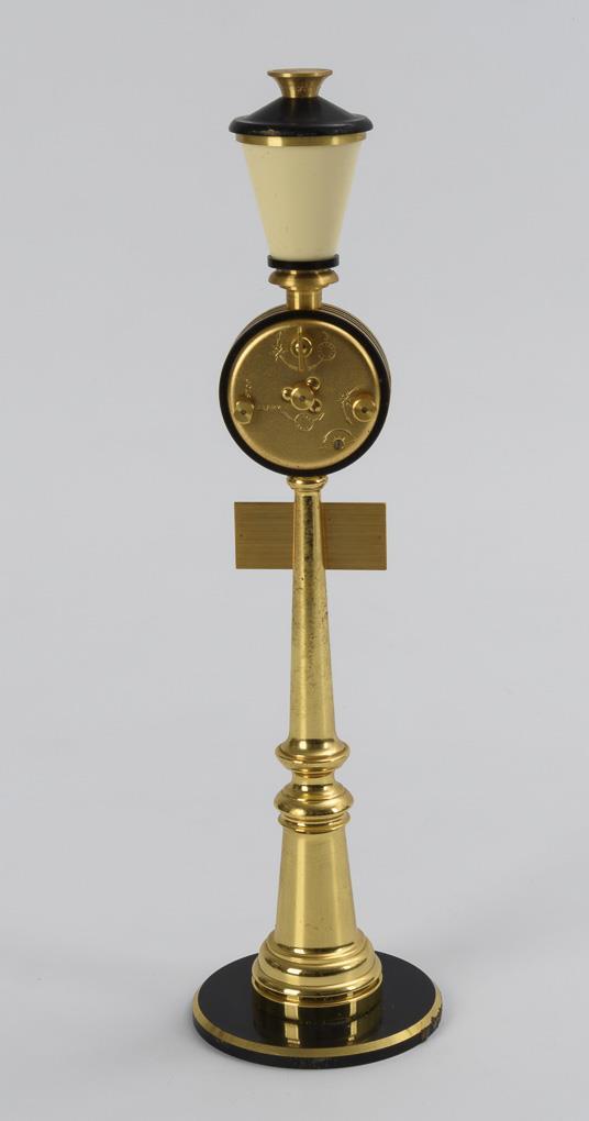 Tischuhr in Form einer Straßenlaterne, auf dem blauen Straßenschild bezeichnet "Rue de la Paix". Minimale Alters- und Gebrauchsspuren.