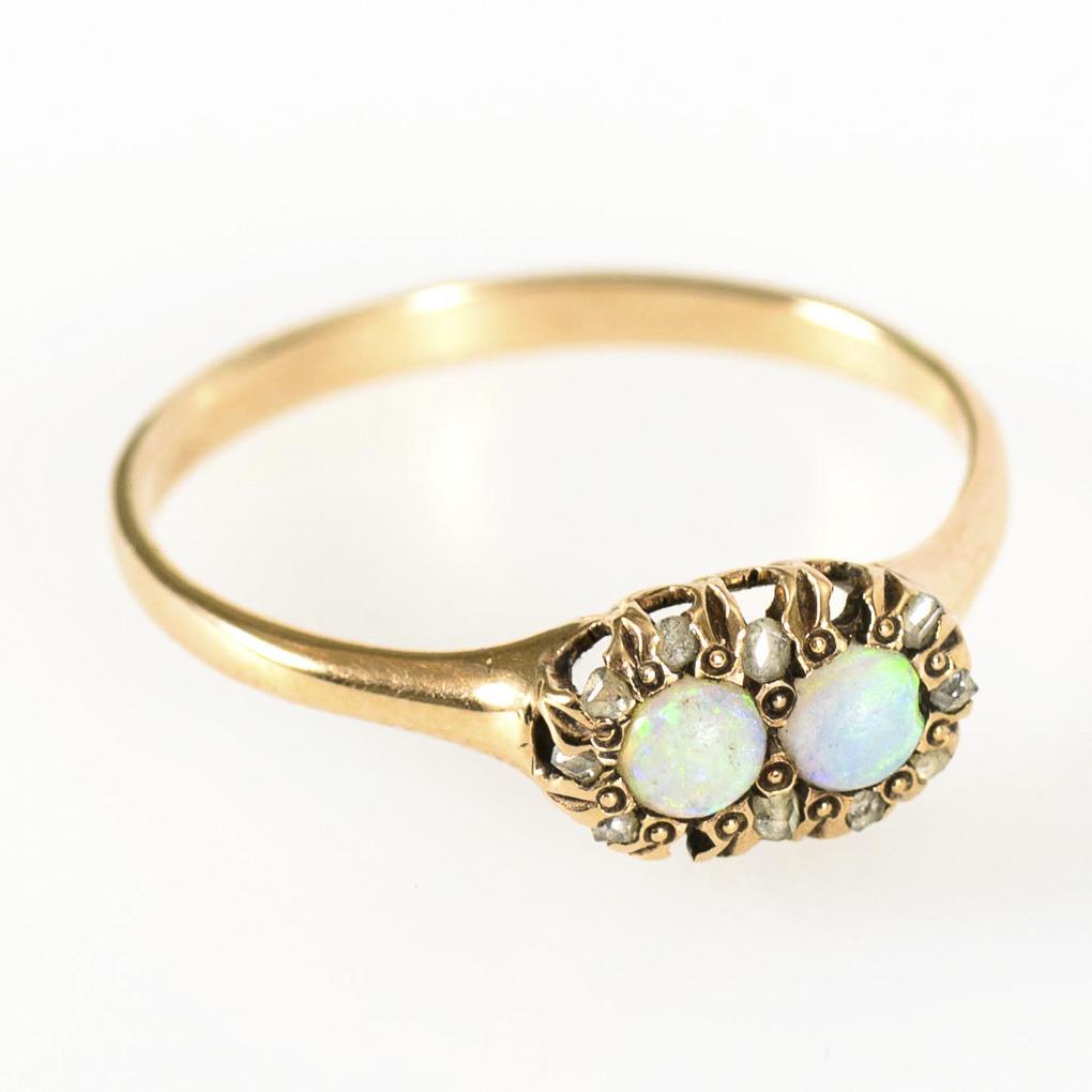 2 kleine Opalcabochons und 10 Diamantrosen, zwischen schmaler Schiene. 2 Diamantrosen fehlen.