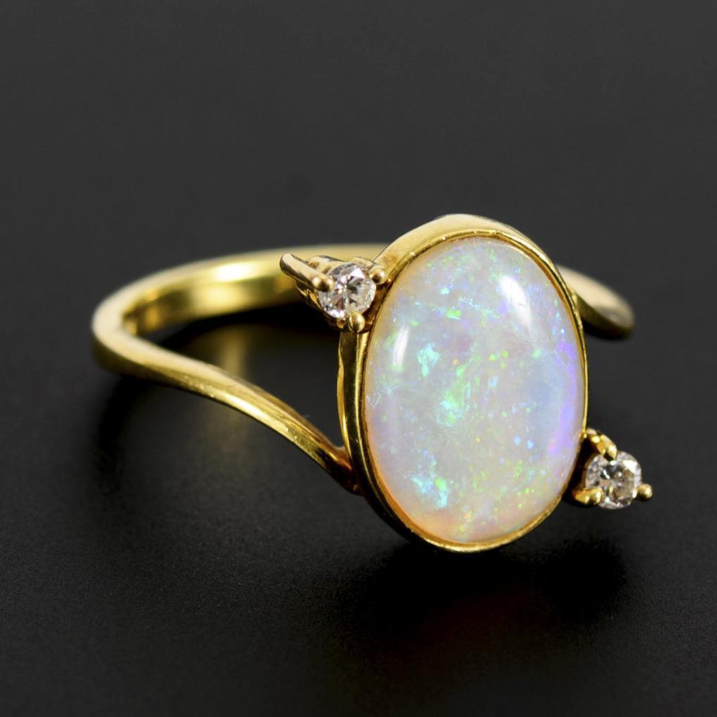 Zargengefasster Cabochon und 2 kleine chatongefasste Brillanten, zwischen schmaler Schiene.