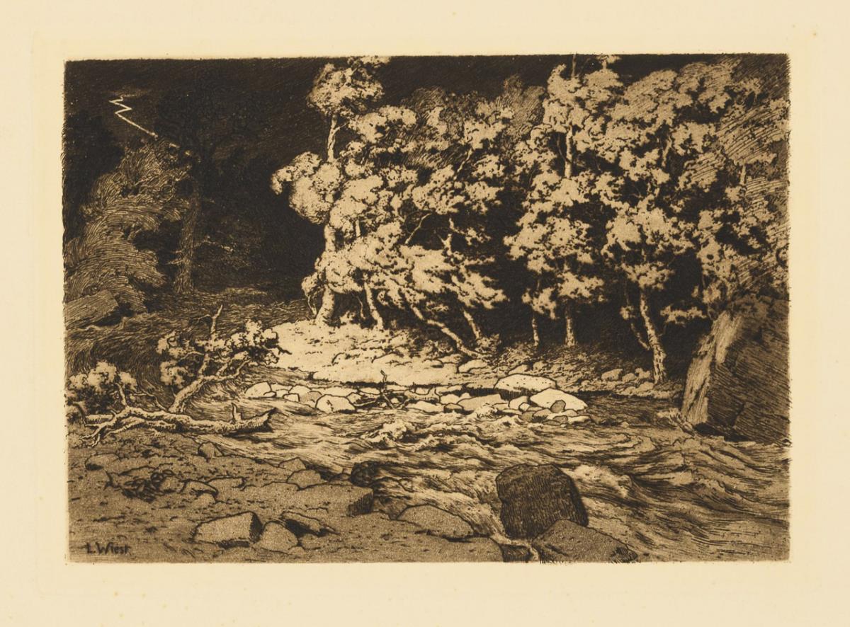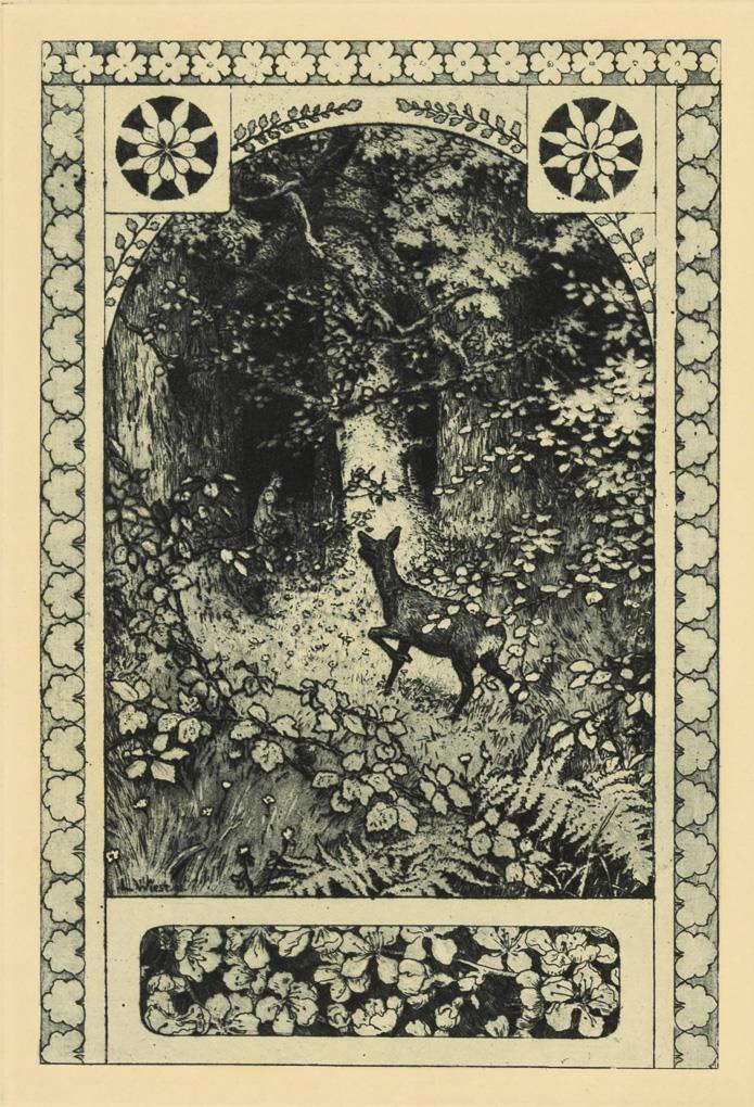 "Reh und Königstochter" (1902) | "Zur Maienzeit" (1895) | "Sturm" (1897) | "Zur Maienzeit" (1895); aus den Jahresmappen des Weimarer Radiervereins. Je etwas stockfleckig, je lichtgebräunt, Ecke bestoßen.