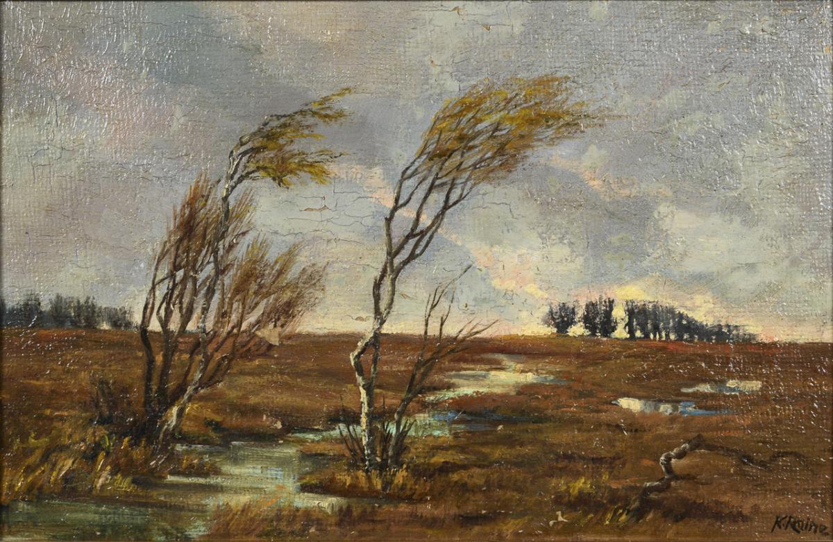 Weite ebene Landschaft mit Windflüchtern unter wolkigem Herbsthimmel. Wenige Farbabsplitterungen.