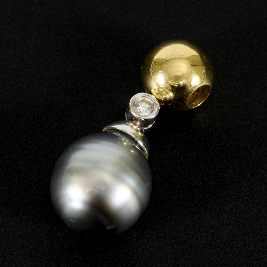 Tropfenförmige Zuchtperle und zargengefasster, kleiner Brillant an Kugelöse. leichte Wachstumsringe.