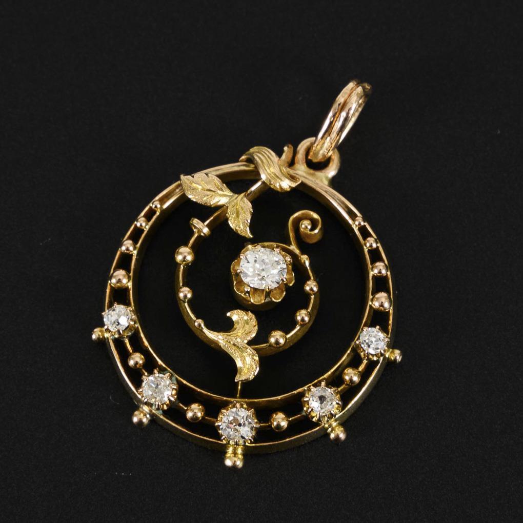 Verzierter Rahmenanhänger mit 6 chatongefassten Altschliff-Diamanten.