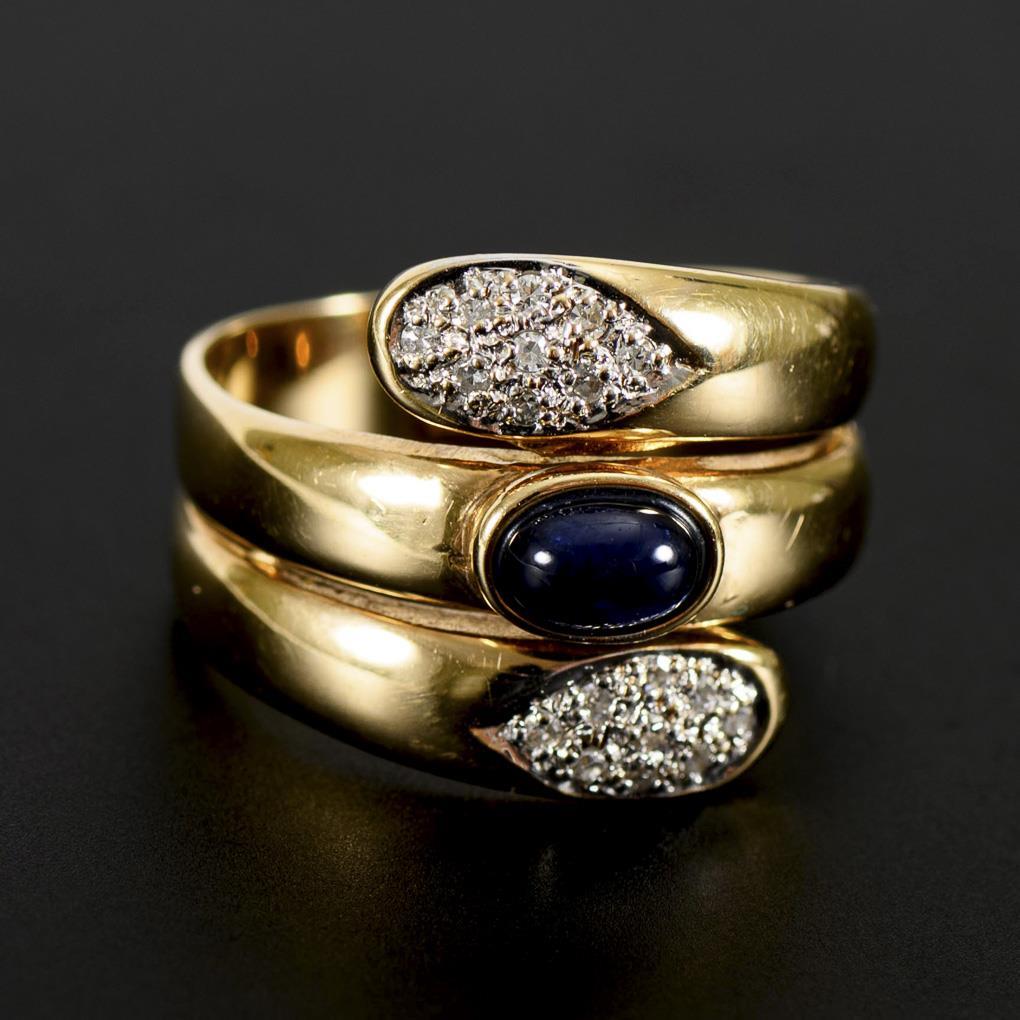 Breiter, stilisierter Schlangenring mit zargengefasstem Saphircabochon und 18 eingelassene Diamanten.