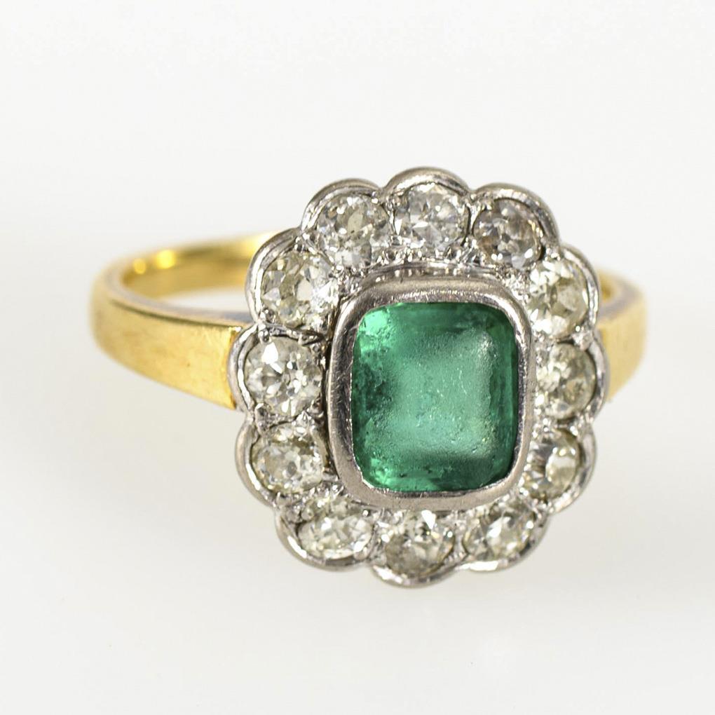 Art-déco-Ring mit Farbstein und Altschliff-Diamanten.
