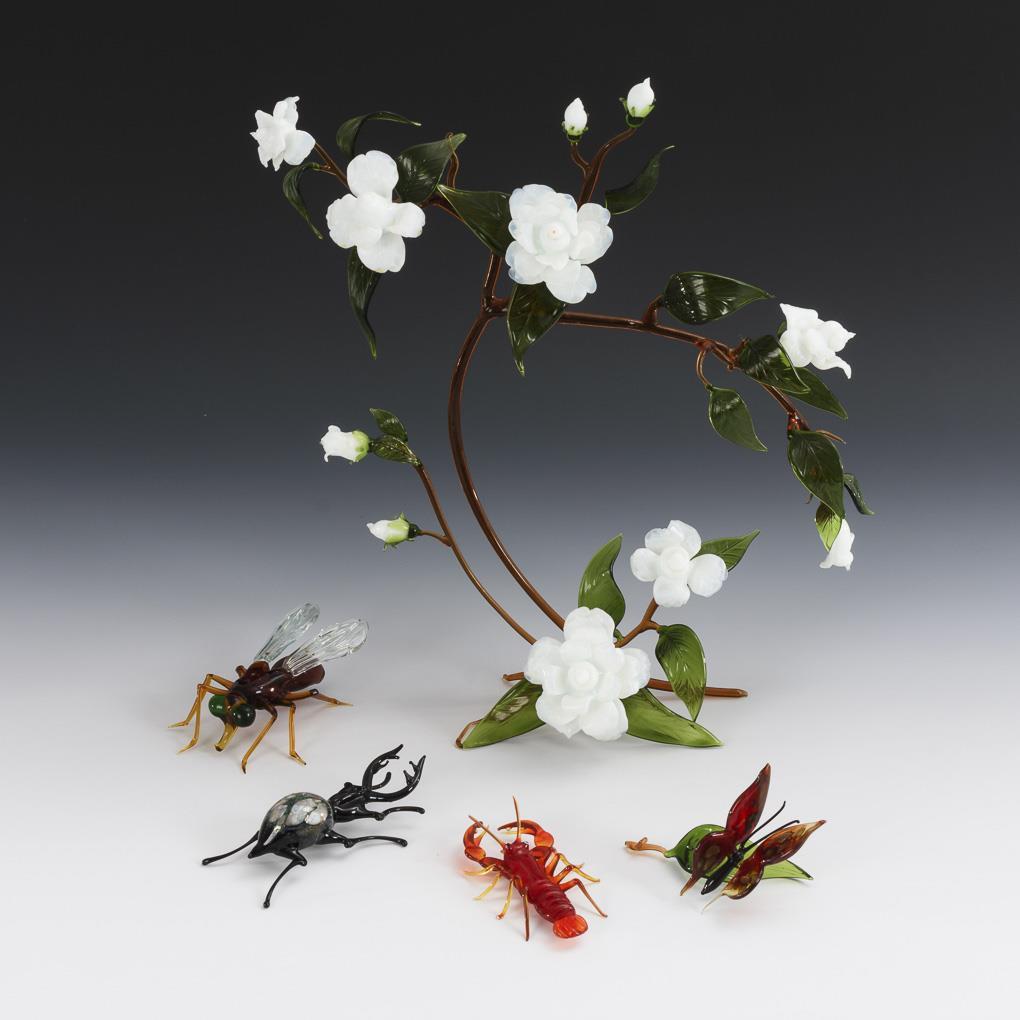 Filigran gestalteter Zweig mit weißen Kamelienblüten (H 37 cm). Dazu vier Tiere: Fliege, Hirschkäfer, Krebs und Schmetterling auf Blatt (L ca. 10-13 cm).