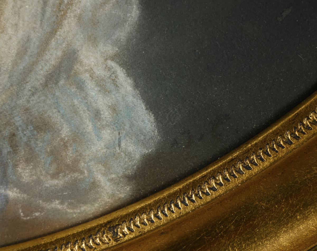 Porträt einer jungen Frau in der Mode des späten 18. Jahrhunderts mit grauer Perücke.