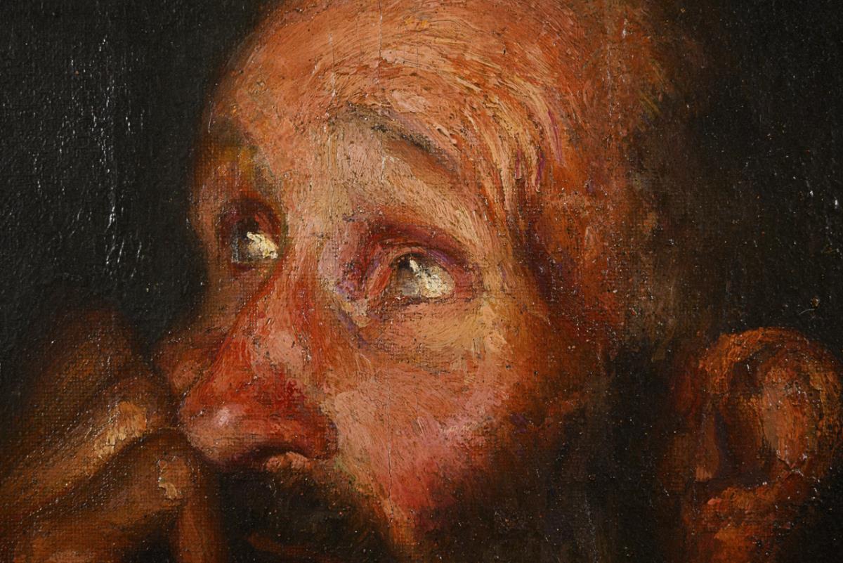 Porträt eines den Kopf auf die Hand gestützten älteren Mannes mit nach oben gerichtetem Blick vor dunklem Hintergrund. Restauriert mit Hinterklebungen.