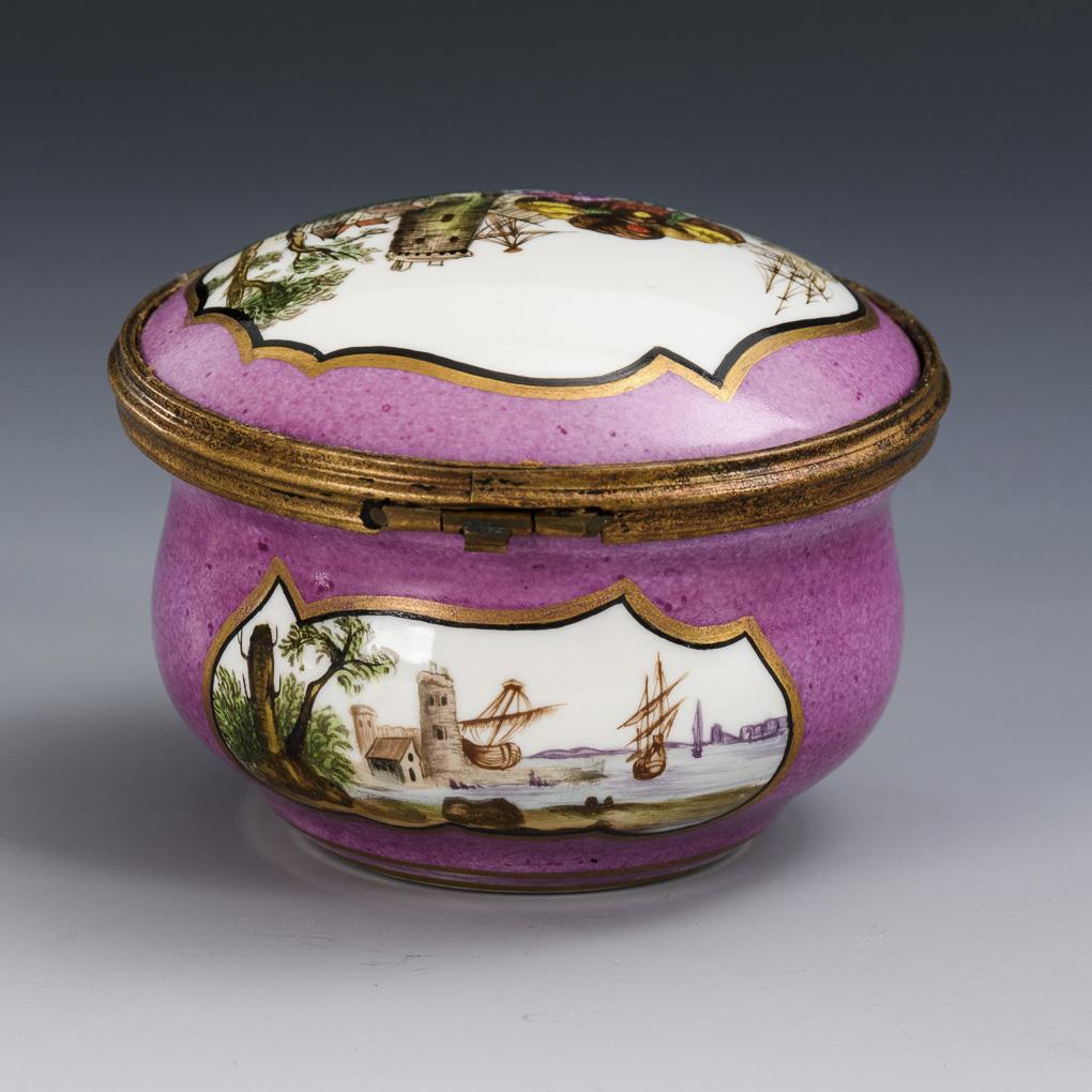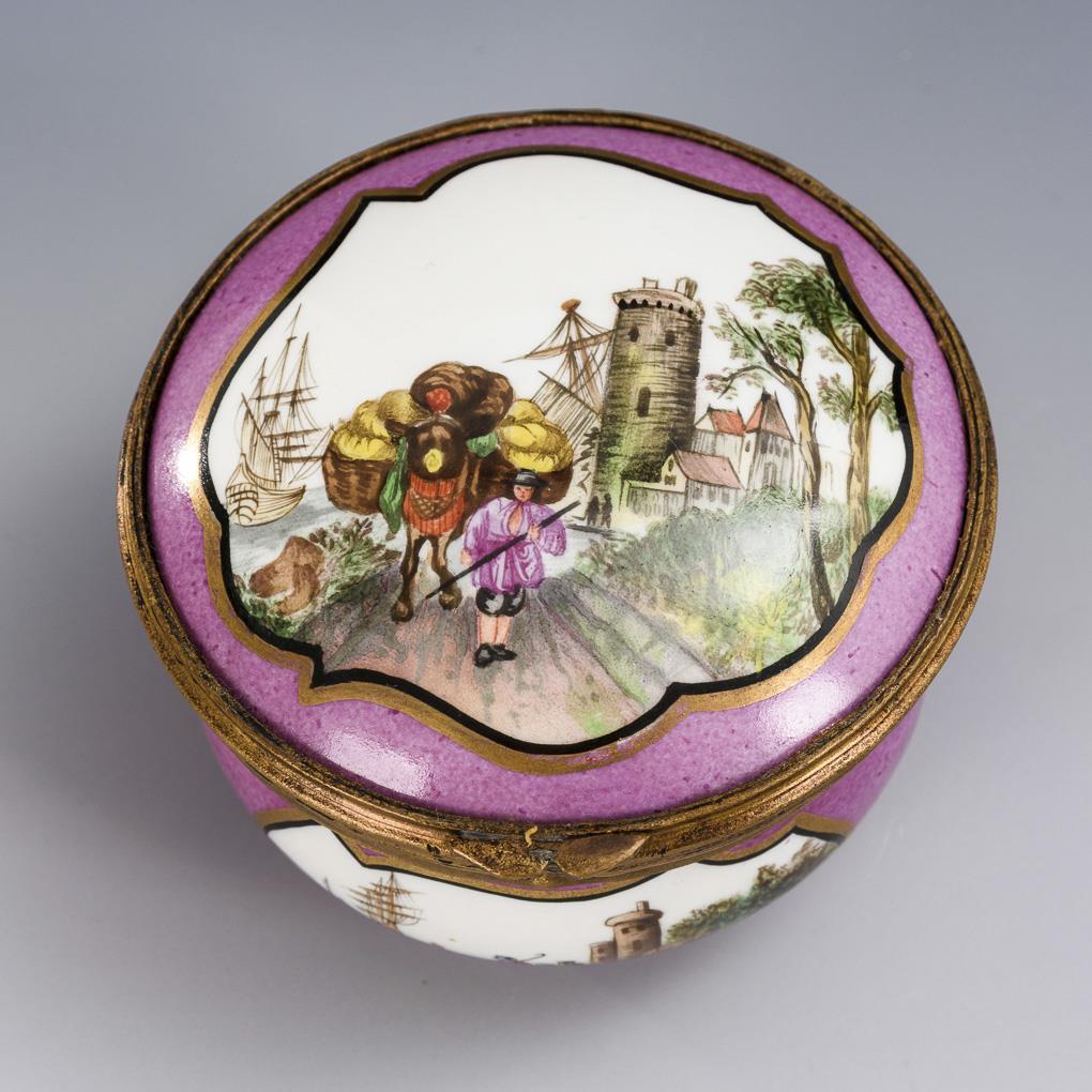 Runde Dose mit metallmontiertem Scharnierdeckel. Purpurfarbener Fond sowie in drei Kartuschen die Darstellung von Hafenszenen.