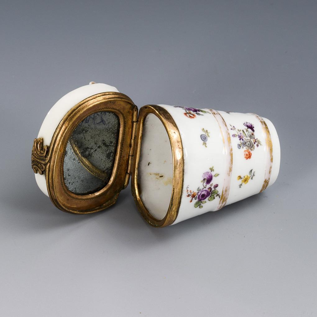 Konisches Döschen mit messingmontiertem Scharnierdeckel. Gearbeitet als Weinkiepe mit Frucht- und Blumenrelief auf dem Deckel. Die Dose diente als Behältnis für die Schönheitspflästerchen der Dame. Im Deckel befindet sich deshalb ein kleiner Spiegel, mit dem die richtige Platzierung der Pflästerchen kontrolliert werden konnte. Gold etwas berieben.